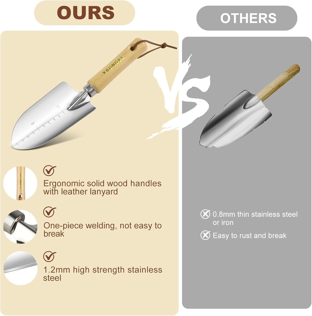 Durable Stainless Steel Garden Tools: Made with heavy-duty stainless steel that can withstand tough roots, rocks, and soil.