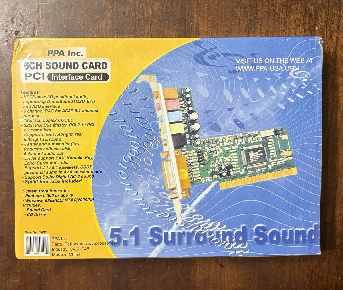 PPA Inc 6-channel PCI sound card supporting full 5.1 surround audio output. Ideal for retro PC builds or upgrading older systems that require PCI-based audio hardware.