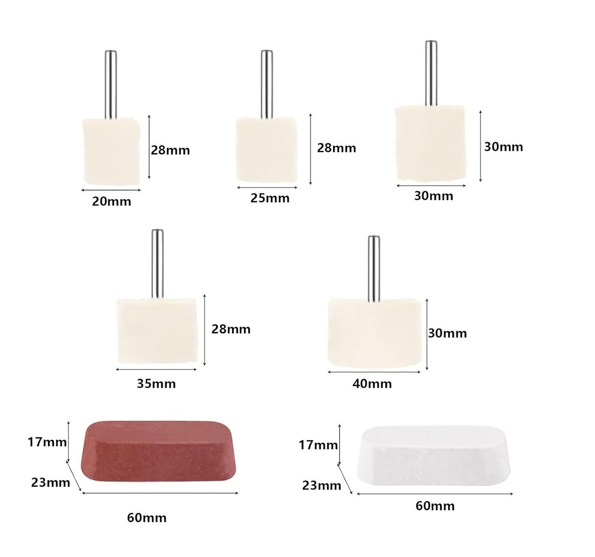 ?1.Package Includes:1pcs 2"(50mm)and 1pcs 3"(75mm)Mushroom shape,1pcs 1.57"(40mm)cylindrical,1pcs 2"(55mm)Conical type,1pcs 1pcs 2"(50mm),3"(75mm)and 1pcs 4"(100)circular,5pcs felt polishing wheel 2 Pcs Polishing Compound ?2.Complete And Professional Polishing Kit:Specially designed for polishing recessed aread such as car,motorcycle wheels manifolds, great for wheels, fenders, bumpers and other hard to reach spots. ?3.Excellent workmanship:made out of good quality lint,multiple layers of fabric sewn together in the center, soft and delicate,which will not scratch your furniture and car ?4.Polishing Rouge Compound:These Compounds are color coded for easy identification in a scale from coarse to fine. It can emit black cold light after polishing, and the brightness reaches the mirror level. It contains high anti-rust and oil components and prolongs the anti-rust life of the product. ?5.Wide Application: Work with almost all of the drills to polish metal and non-metal products such as manifold, aluminum, stainless steel, copper, wood, chrome, plastics, ceramics, glass, jewelry products etc