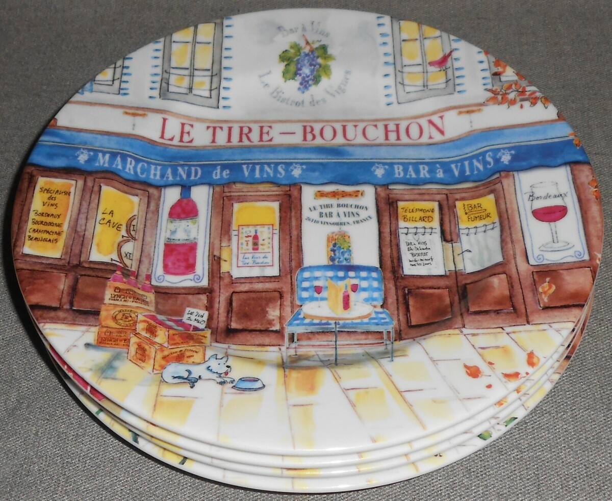 Set (4) Sisson Imports LE TIRE-BOUCHON 7 1/4" Porcelain Plates JILL BUTLER