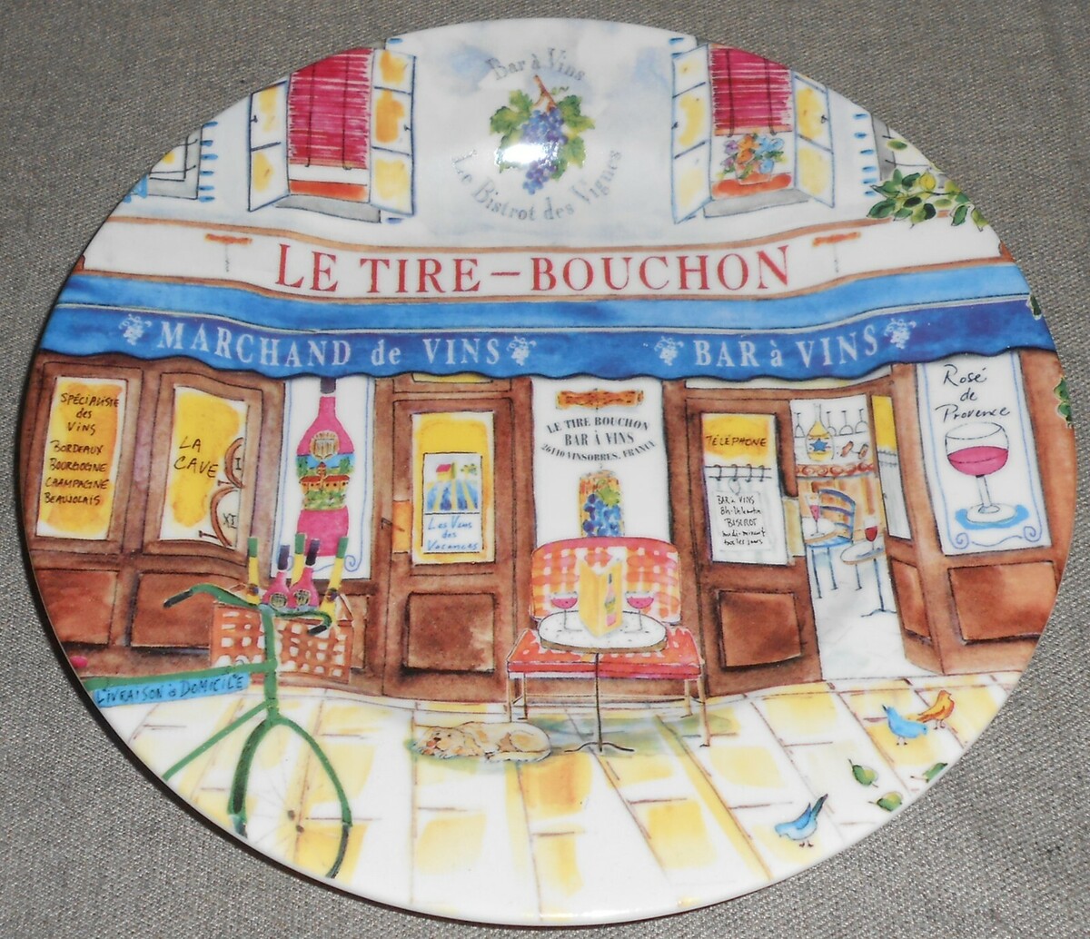 This is a Set of (4) 7 1/4" Porcelain Plates from Sisson Imports and The fRench Collection by Jill Butler. The graphics depict wine bars and reads LE TIRE-BOUCHON above and the plates are all in good pre-owned condition with no chips or damage.