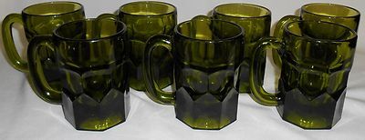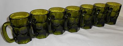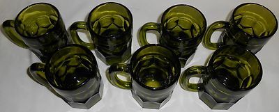 This is a set of (7) Mid Century Avocado Green Color Indiana Glass Heavy Glass Mugs that hold approx 10 ounces and measure approx 4 5/8" tall x 3 3/8" across. They are all in generally good condition - two mugs have a very tiny chip near bottom - two mugs have a slight rough spot on one of the seams - one mug has a tiny chip in clear part near top of mug. All of these defects are extremely minor and have no effect on use or display of mugs. Due to the size and design of the mugs these flaws would be common and when using or just looking at the mugs they don't really have any impact if you can even see them at all.