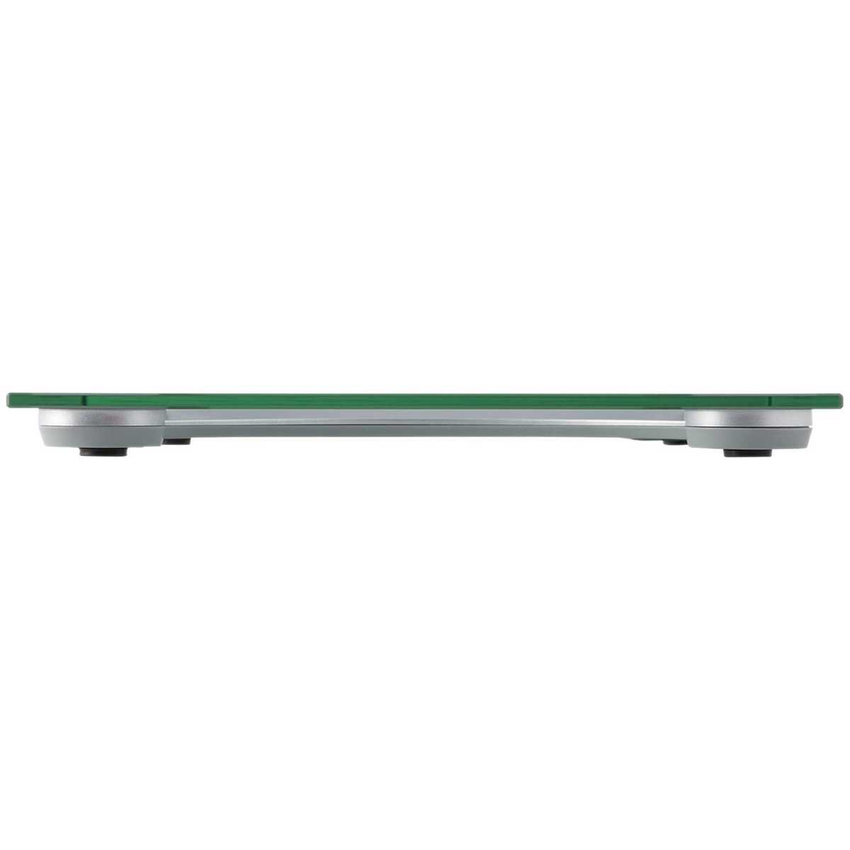 ? Measures up to 400 lbs. in .2 lb. increments;? Step-on instant read;? Auto zero;? Clear glass with metalic accents;? Dimensions: 11.8 in. x 11.8 in;? 5-year warranty;? Includes 1 lithium CR2032 battery;