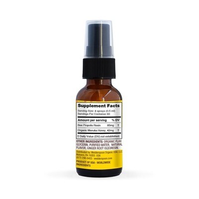 Expiration Date of 5/2026 ? IMMUNE SUPPORT FROM NATURE: Each serving (4 sprays) delivers 85mg of bee propolis packed with antioxidants and vitamins to help strengthen your body?s natural defenses ? DELICIOUS SOOTHING: Bright lemon and warming ginger combine with Manuka Honey for a naturally refreshing taste that comforts your throat ? SOOTHES SCRATCHY THROATS: Infused with Manuka Honey 400+ MGO for gentle, comforting support when your throat feels dry or irritated ? HOLISTIC WELLNESS FORMULA: A powerful blend of bee propolis, herbs, and natural spices for throat comfort and overall well-being ? PORTABLE RELIEF ANYTIME: Compact 1 fl oz spray bottle fits easily in your purse, backpack, or gym bag for on-the-go soothing comfort ? 0 ? 0