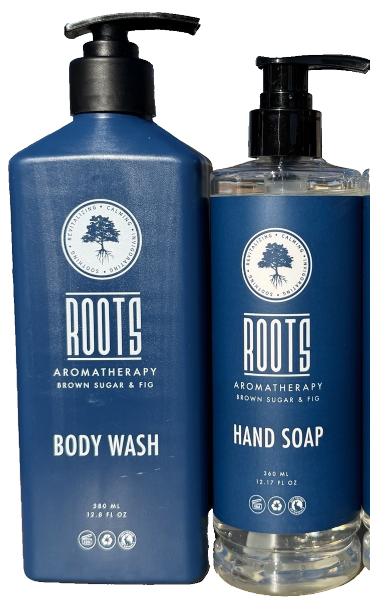 2 Bottle Set ROOTS AROMATHERAPY Body Wash Hand Soap Brown Sugar Fig Scent