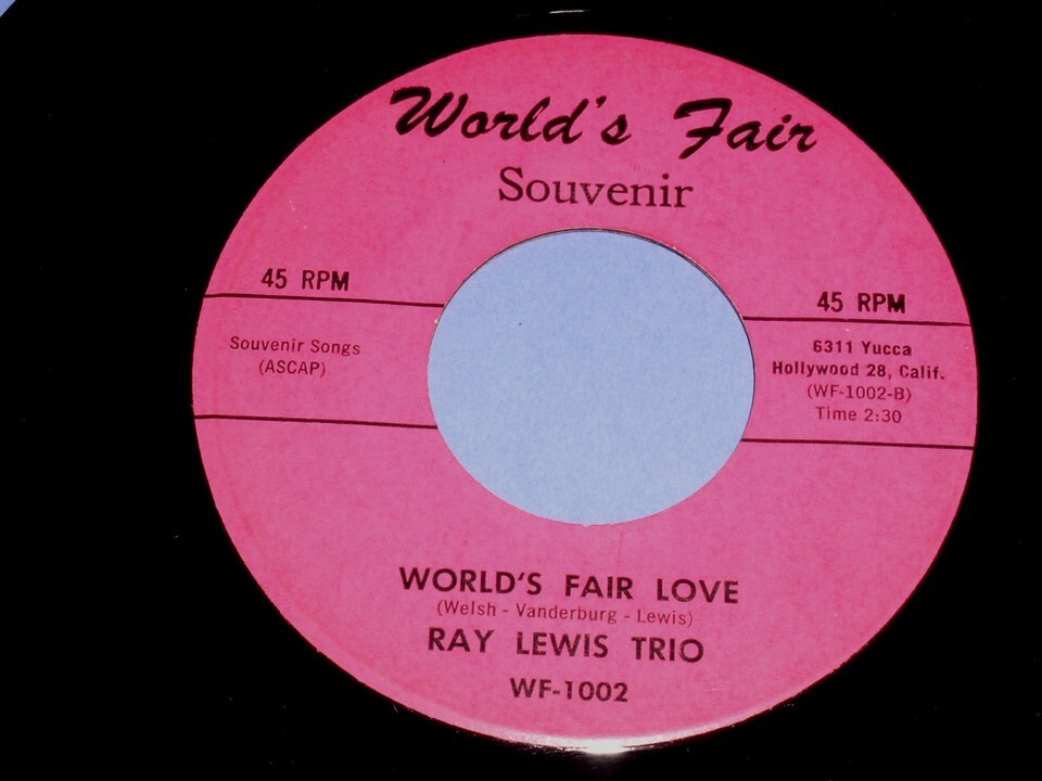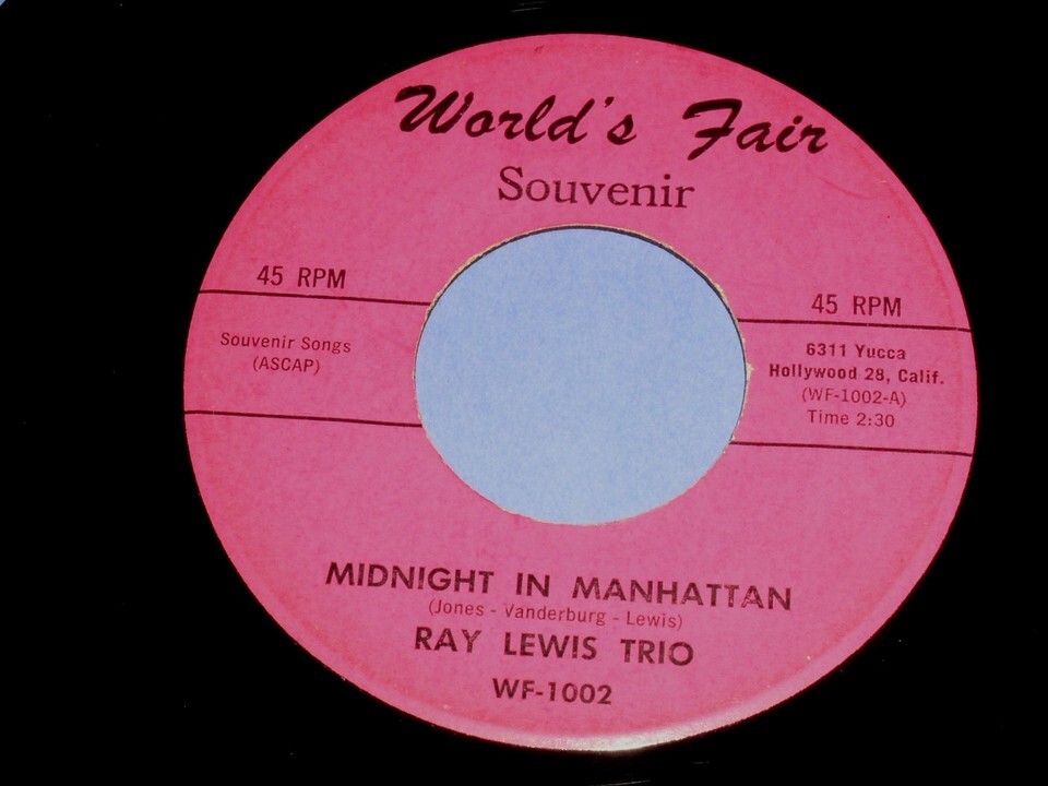 This is a very rare, vintage 45 rpm phonograph record by Ray Lewis Trio, entitled, "Midnight In Manhattan". Flipside: "World's Fair Love". Record label: World's Fair WF-1002. Label states Souvenir and is the very scarce pink label single, not the extended play and not listed as Ray Lewis Combo.