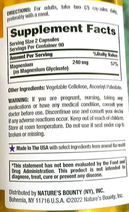 Nature's Bounty Magnesium Glycinate 240 mg Muscle Relaxation 180 Ct EXP 04/2028