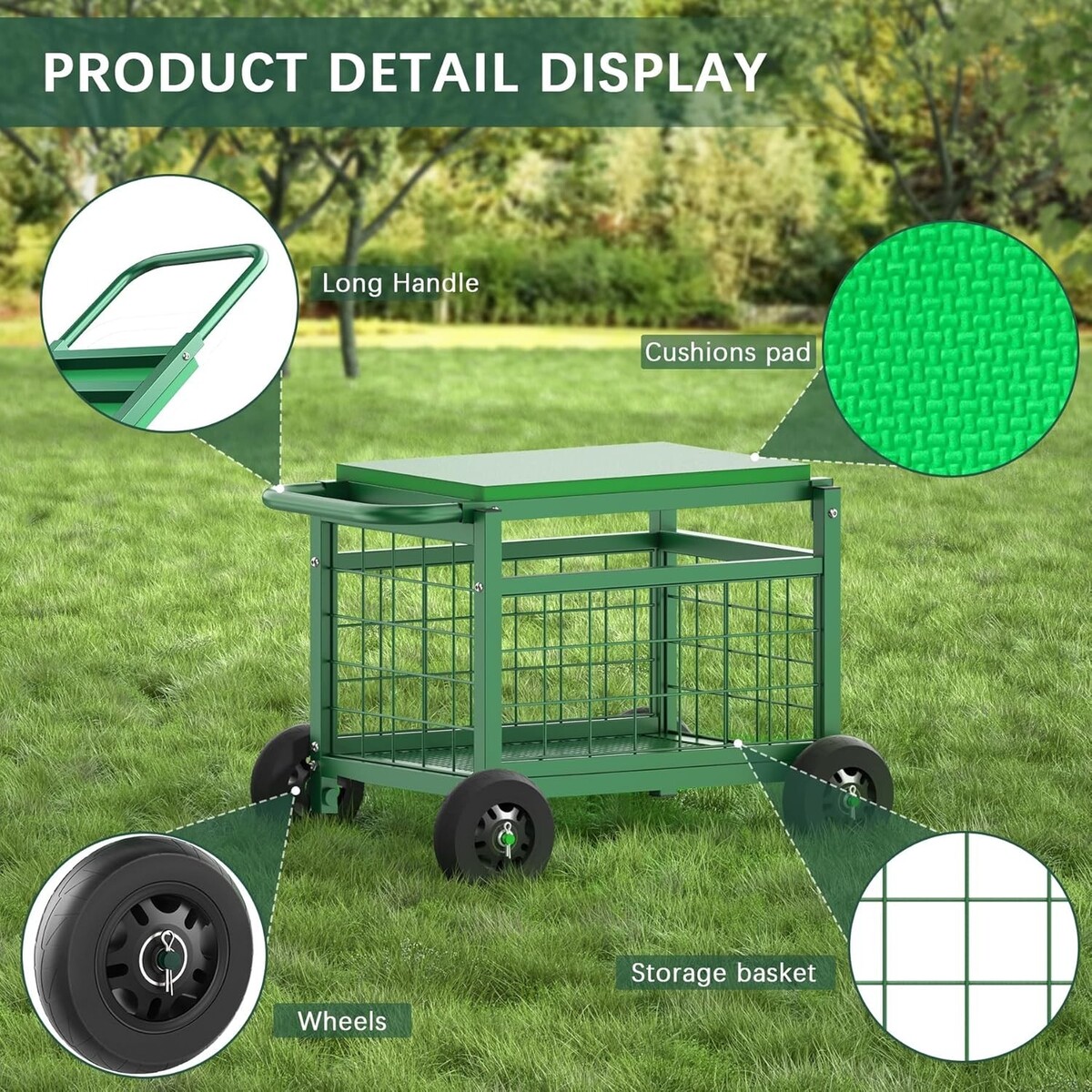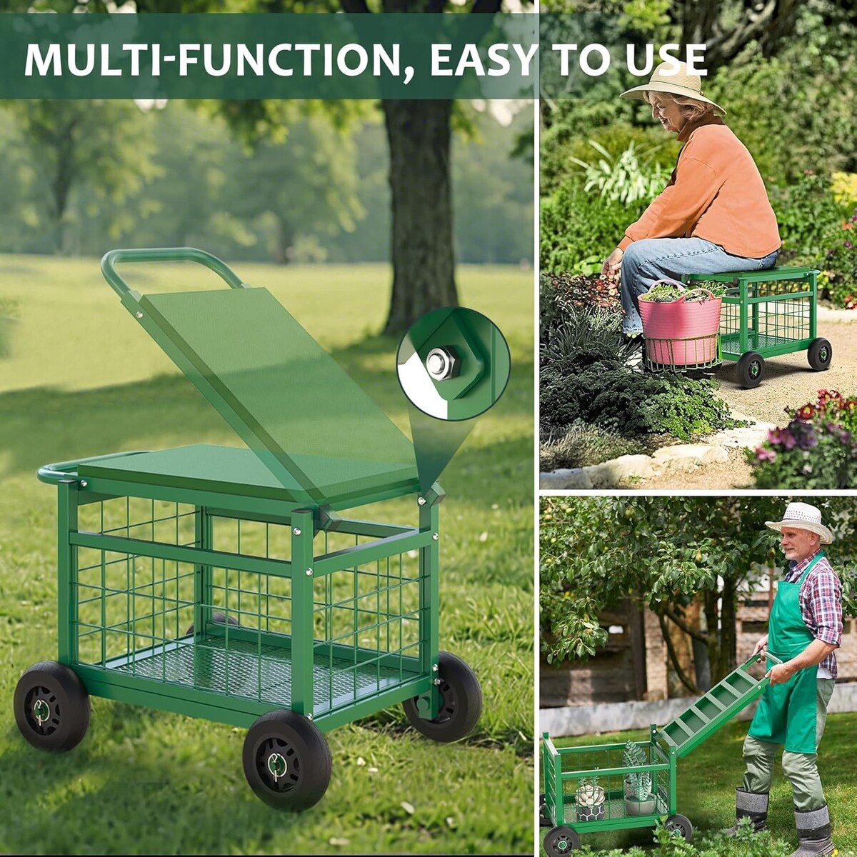 Genius 4-in-1 Design: A versatile garden cart that doubles as a comfortable work seat with a spacious inner storage basket and multipurpose lid, designed to alleviate back and knee pain.