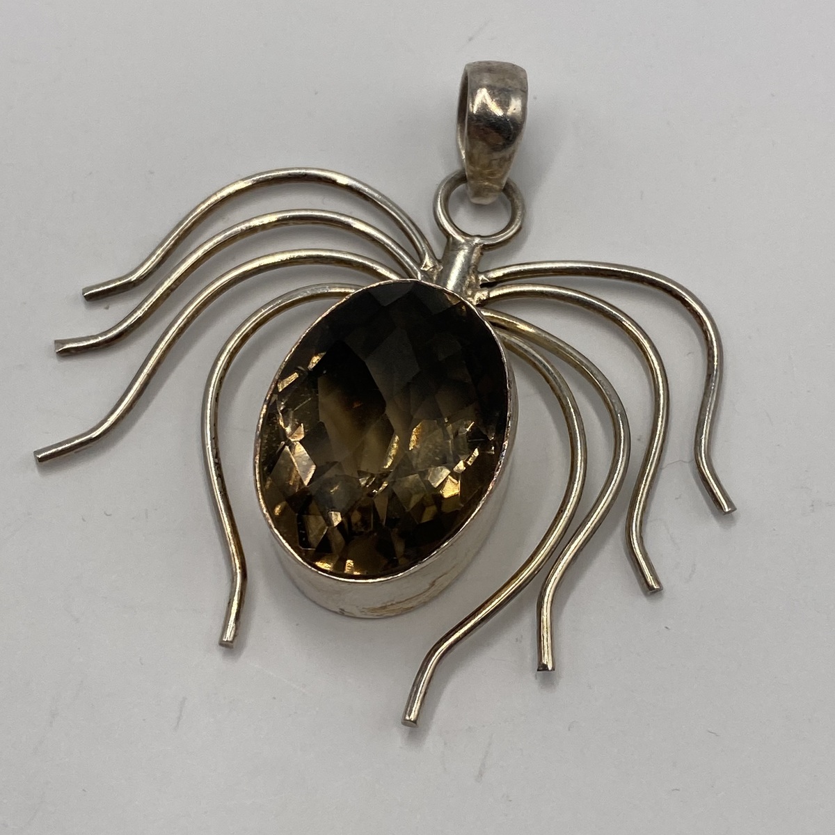 This bold and sculptural piece features a large faceted gemstone resembling smoky quartz, securely set in a solid silver body. The expressive spider design gives the pendant a strong character, making it a statement accessory or an eye-catching collectible.