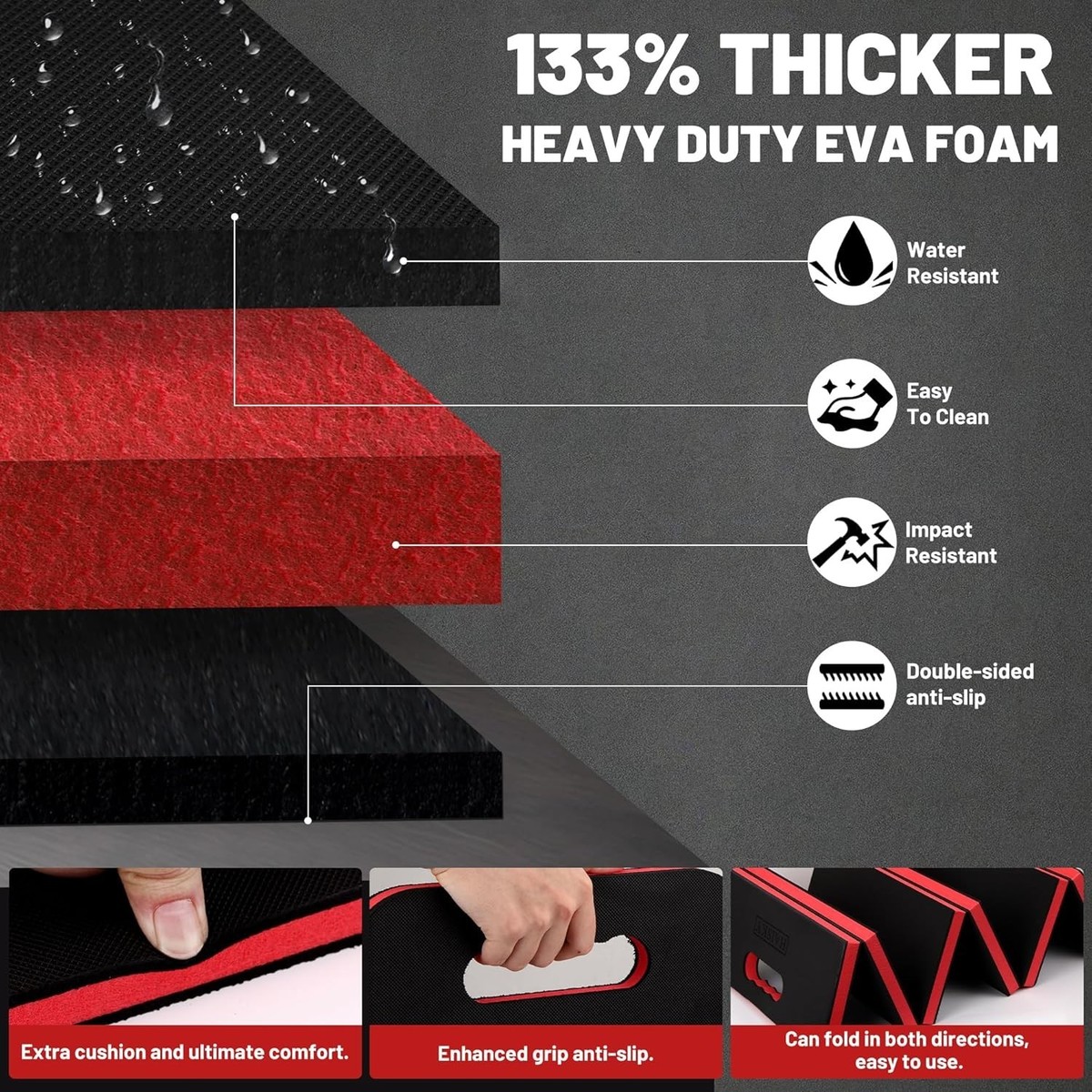 Crafted from 3-layer high-density EVA foam material, ensuring exceptional support and minimizing discomfort while kneeling.