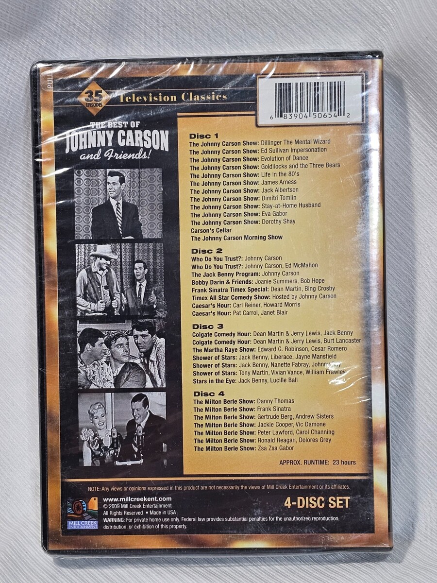 Description of item: The Best of Johnny Carson and Friends is a 4-disc DVD collection featuring 35 classic television episodes showcasing one of late night?s most legendary hosts. This ?Legends Series? set highlights memorable moments from The Johnny Carson Show and appearances alongside some of the biggest names in classic television.