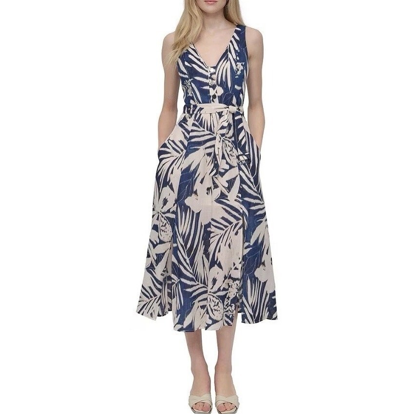 Elevate your summer-to-fall wardrobe with this DKNY sleeveless maxi dress, cut in a navy and cream ikat-inspired print that merges modern minimalism with boho-chic ease. The lightweight fabric drapes beautifully with a flowy silhouette, cinched at the waist with a removable tie belt for versatile styling. Features a deep V-neckline, button-front detail, and a full-length skirt for effortless polish.