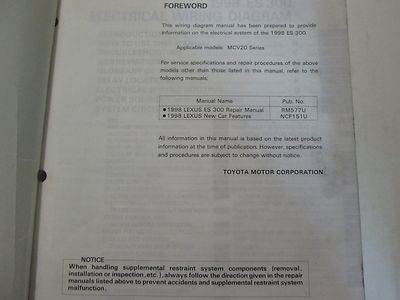 1998 Lexus ES300 Es 300 Servizio Negozio Riparazione Manuale Set W Cavi Book