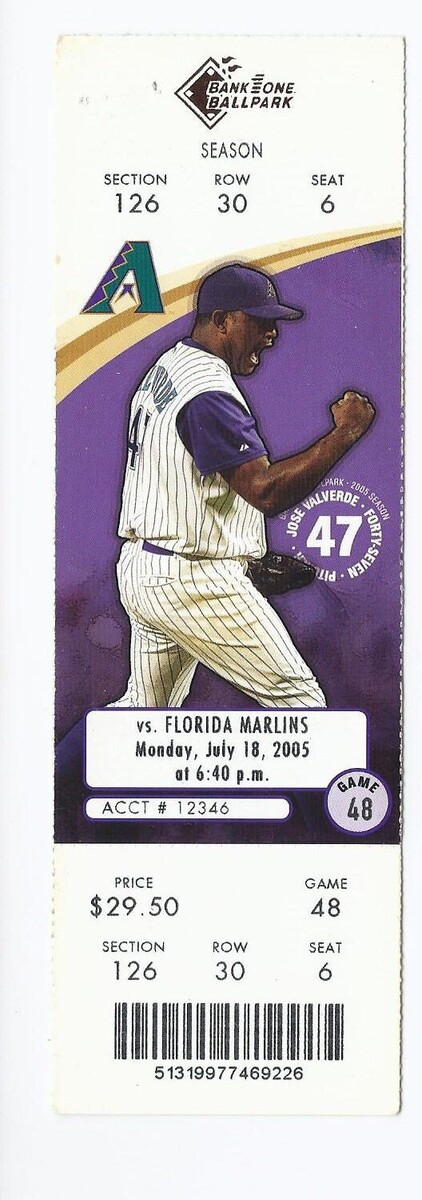 For Sale is a rare and hard to find vintage 2005 Florida Marlins @ Arizona Diamondbacks Full Unused ticket July 18th. Its In good used Condition with Some Minor Handling wear as pictured we have included one of the front and back. Please ask Any and All Questions prior to purchasing. Fast Same or Next day shipping with Free Delivery Confirmation within the U.S. Payment Due within 7 days of purchase (if you need more time please let us know In advance) we love to combine shipping is always a Yes and Most of the time Additional Items Ship for free.