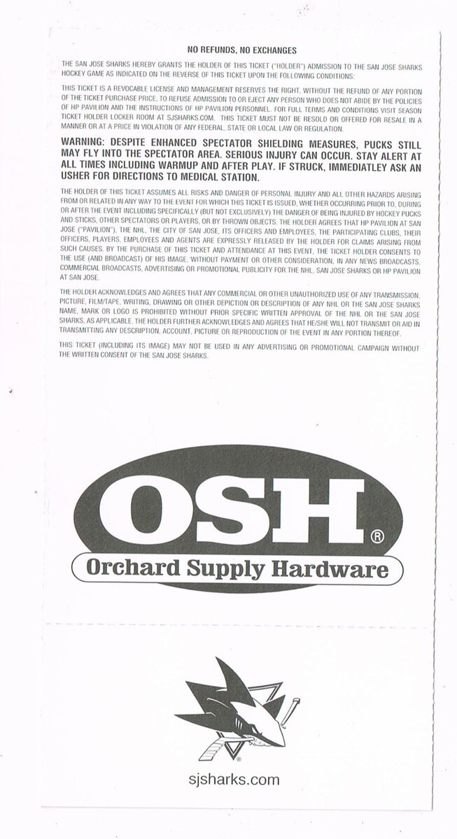 2009 NHL Regular Season Ticket Phoenix Coyotes @ San Jose Sharks Oct 12th