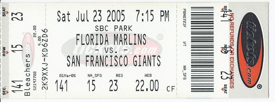 2005 Marlins @ San Francisco Giants Full Unused ticket July 23rd Cabrera HR