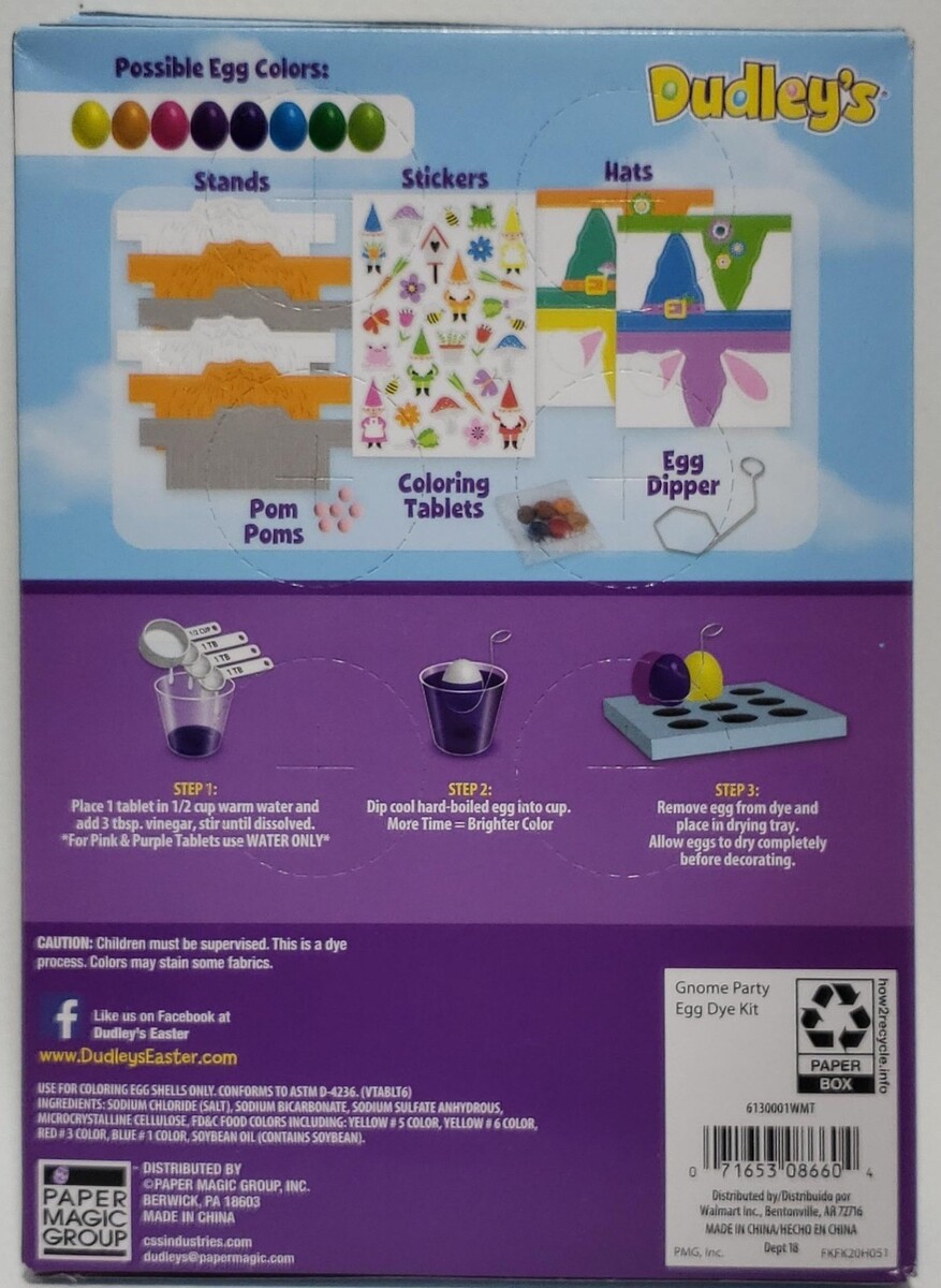 Contents: 6 coloring tablets, 1 egg dipper, 6 egg stands, 30 stickers, 6 gnome hats, 6 pom-poms, and instructions.