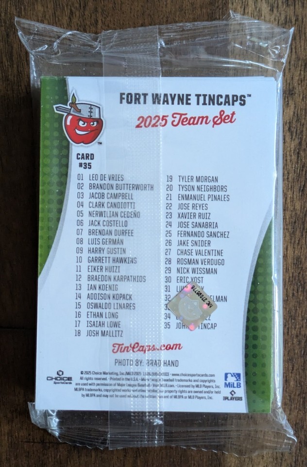 Up for sale is a new sealed 2025 Fort Wayne TinCaps minor league card set. This set is manufactured by Choice Sports Cards with a limited print run. Featured in the set is the San Diego Padres top prospect, Leo De Vries, in his first team issued minor league set. Shipping for this item is $4.75 and the set will be shipped in a padded bubble mailer. Thanks for looking!