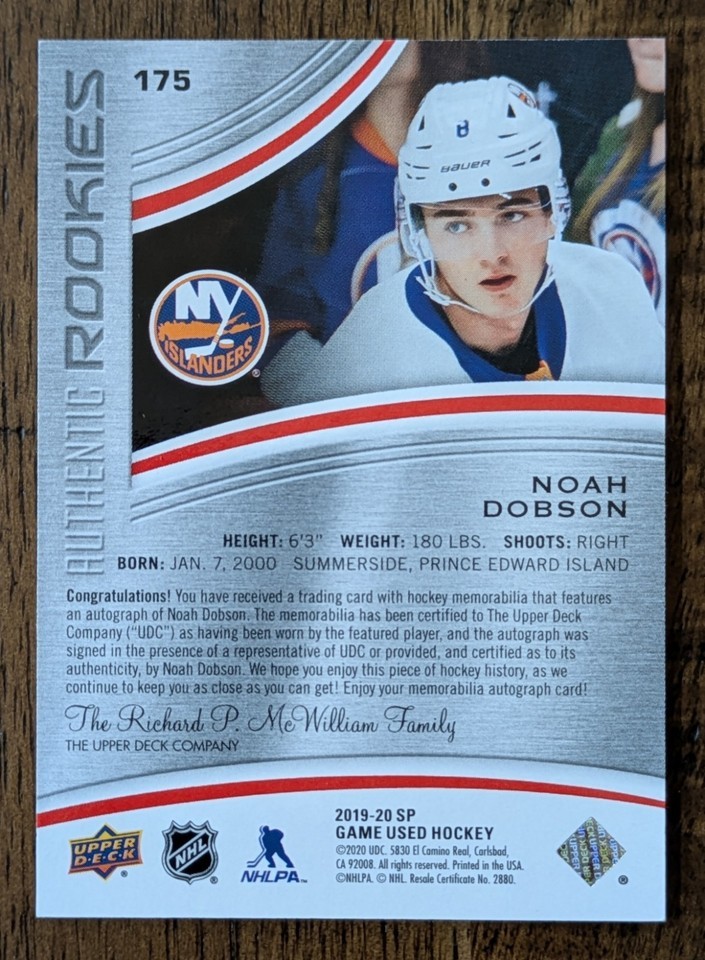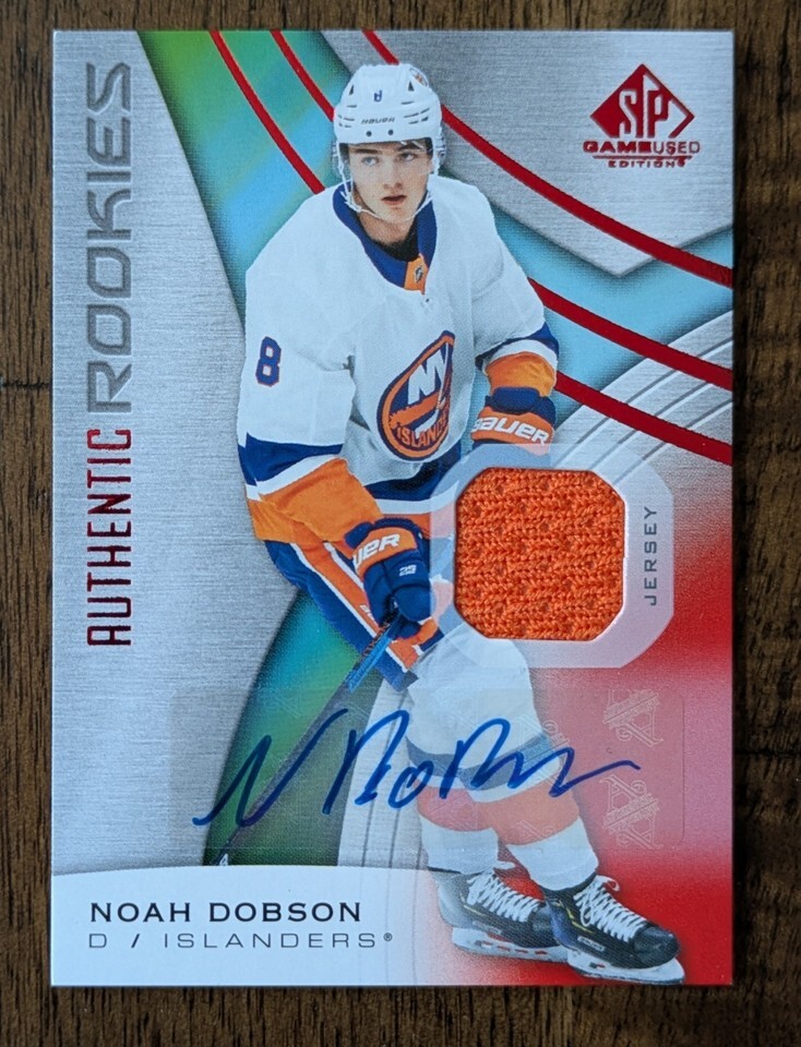 The 2019-20 SP Game Used Noah Dobson Rookie Red Autograph Jersey trading card is a highly sought-after collectible for fans of Noah Dobson. This single card features an authentic autograph from Dobson, along with an orange jersey swatch from his Islanders' jersey, making it a valuable addition to any sports memorabilia collection. With its rookie designation and original printing by Upper Deck, this card captures a significant moment in Dobson's early career, making it a prized item for collectors and fans alike. Shipping for this item is $4.75 and card will be shipped in a padded bubble mailer. Thanks for looking!