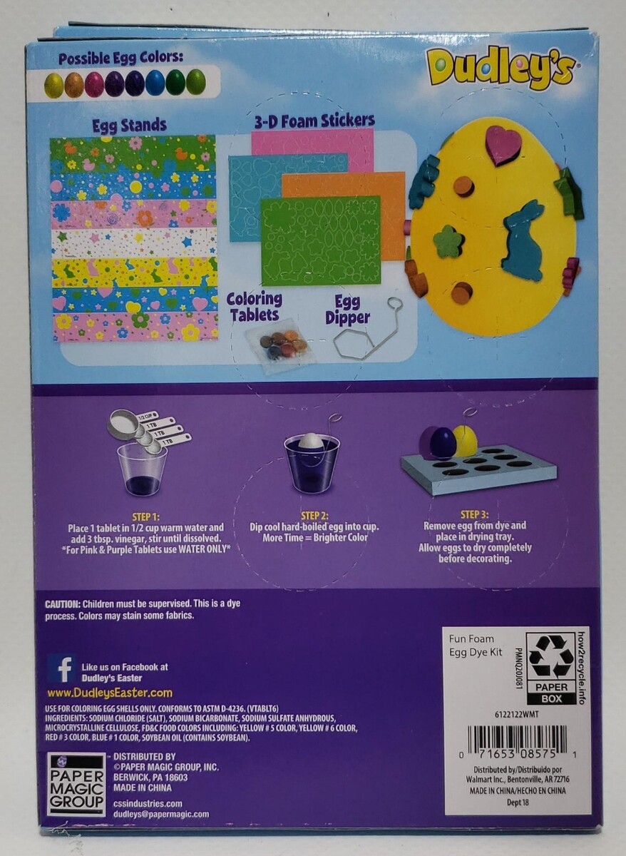 Includes 6 coloring tablets, 1 egg dipper, 7 egg stands, and 137 foam stickers.