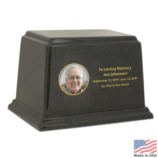 Crafted from premium black stone and made in the USA, this urn combines natural beauty with personal remembrance. It features a customizable photo panel and engraving, offering families a meaningful and lasting tribute to honor a loved one.