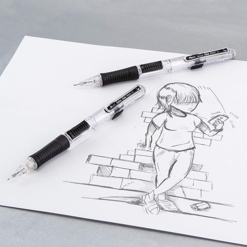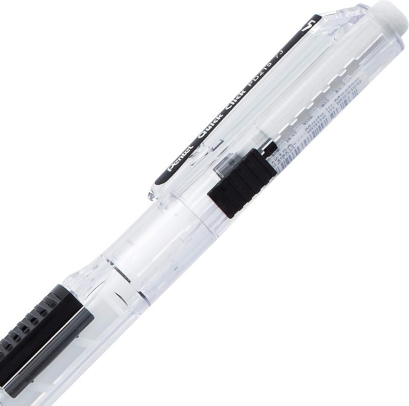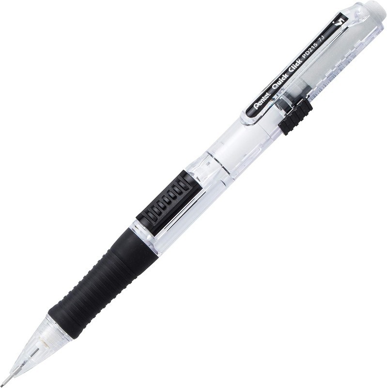 Pentel Quick Click? is the fast and convenient side-advance mechanical pencil! The quick side-advance button advances lead without interrupting your writing. Easy to use slide extends retracts the long-lasting eraser. Latex-free eraser won?t smudge, ghost or tear your paper. Fun clear barrel design with bright color accents. Latex-free grip for hours of comfortable writing. Preloaded with Pentel Super Hi-Polymer HB lead; never needs sharpening, is super strong and writes a clear dark line. Available in 0.5mm and 0.7mm. Backed by a Limited Lifetime Warranty
