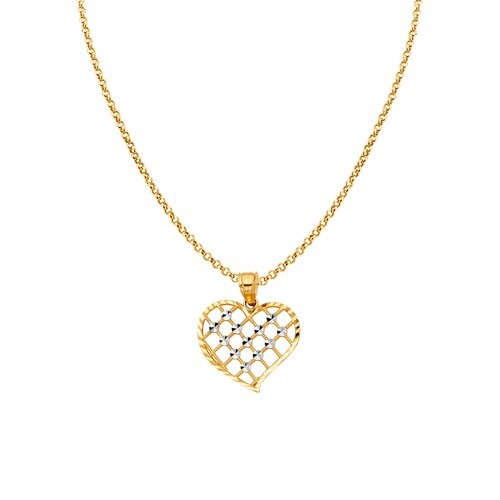 Genuine 14k Two-Tone Gold 0.78" Checkered Heart Pendant Necklace 16" to 22"