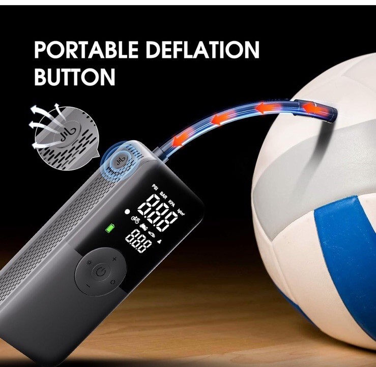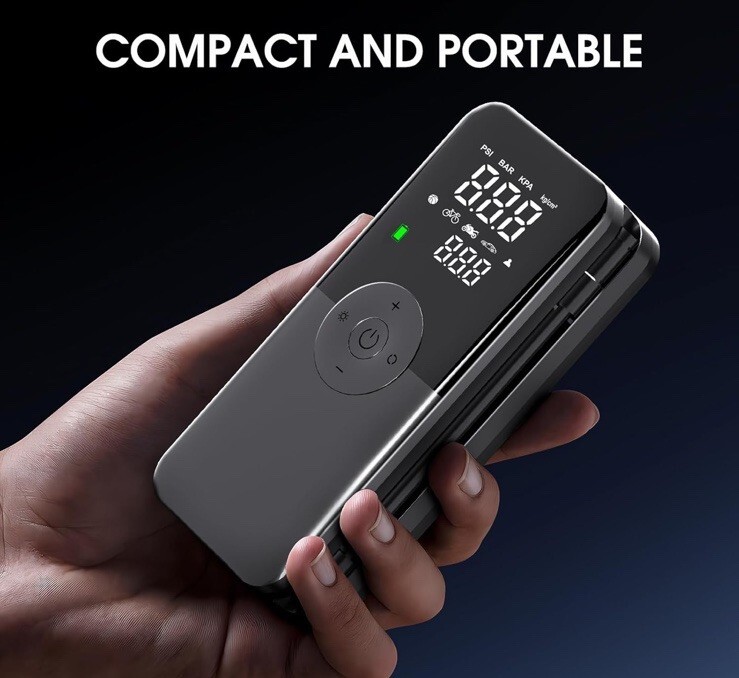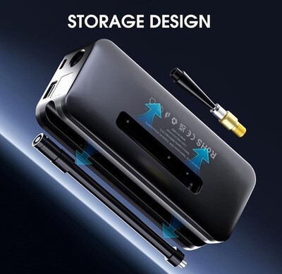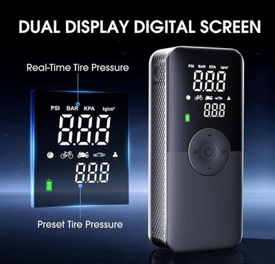 The Portable Air Compressor Cordless Tire Inflator with Digital Screen 150PSI is a compact and convenient pancake air compressor designed for use on the go. With a maximum working pressure of 150 Psi, this portable compressor is perfect for inflating car tires and other inflatable items while traveling or away from a traditional air compressor. The digital screen provides easy monitoring of inflation levels, and the cordless design adds to its portability and ease of use. Made in the United States, this product ensures quality and reliability for various air inflation needs.