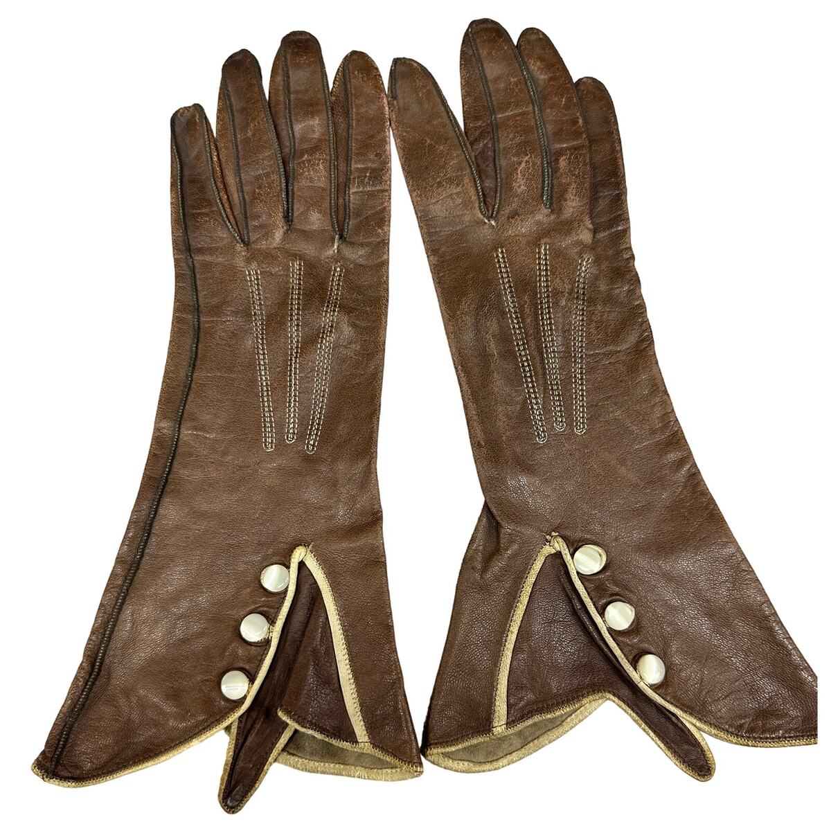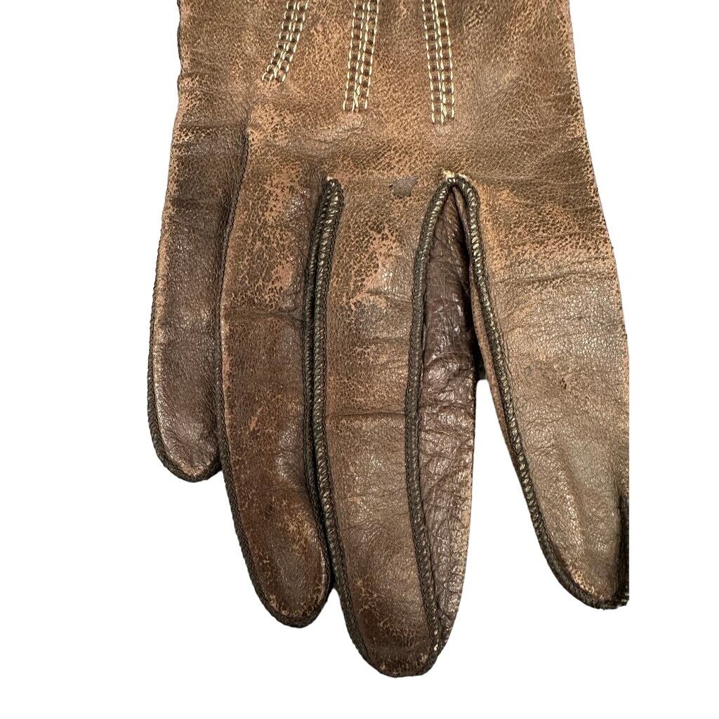 What you?ll love about these 1920s?30s brown leather gauntlet gloves is the dramatic cuff and luminous White River pearl buttons ? pure Art Deco motoring elegance. The sculpted gauntlet flare, off-white piping, and precise topstitching give them that cinematic ?arriving by roadster at dusk? energy. They?re refined, rare, and beautifully made.