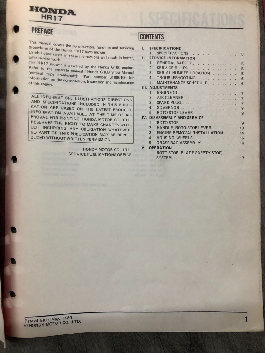 Tosaerba Honda HR17 del 1981 Manuale di riparazione dell'officina di assistenza e supplemento Honda HR17 PDAM del 1983