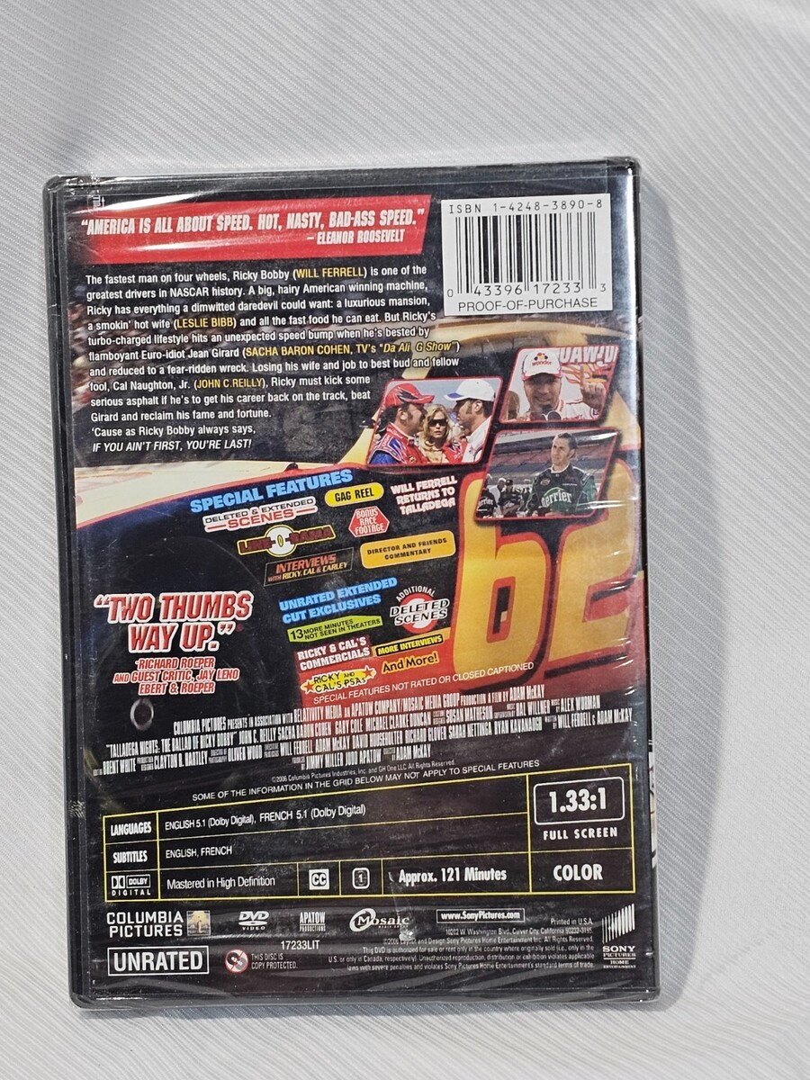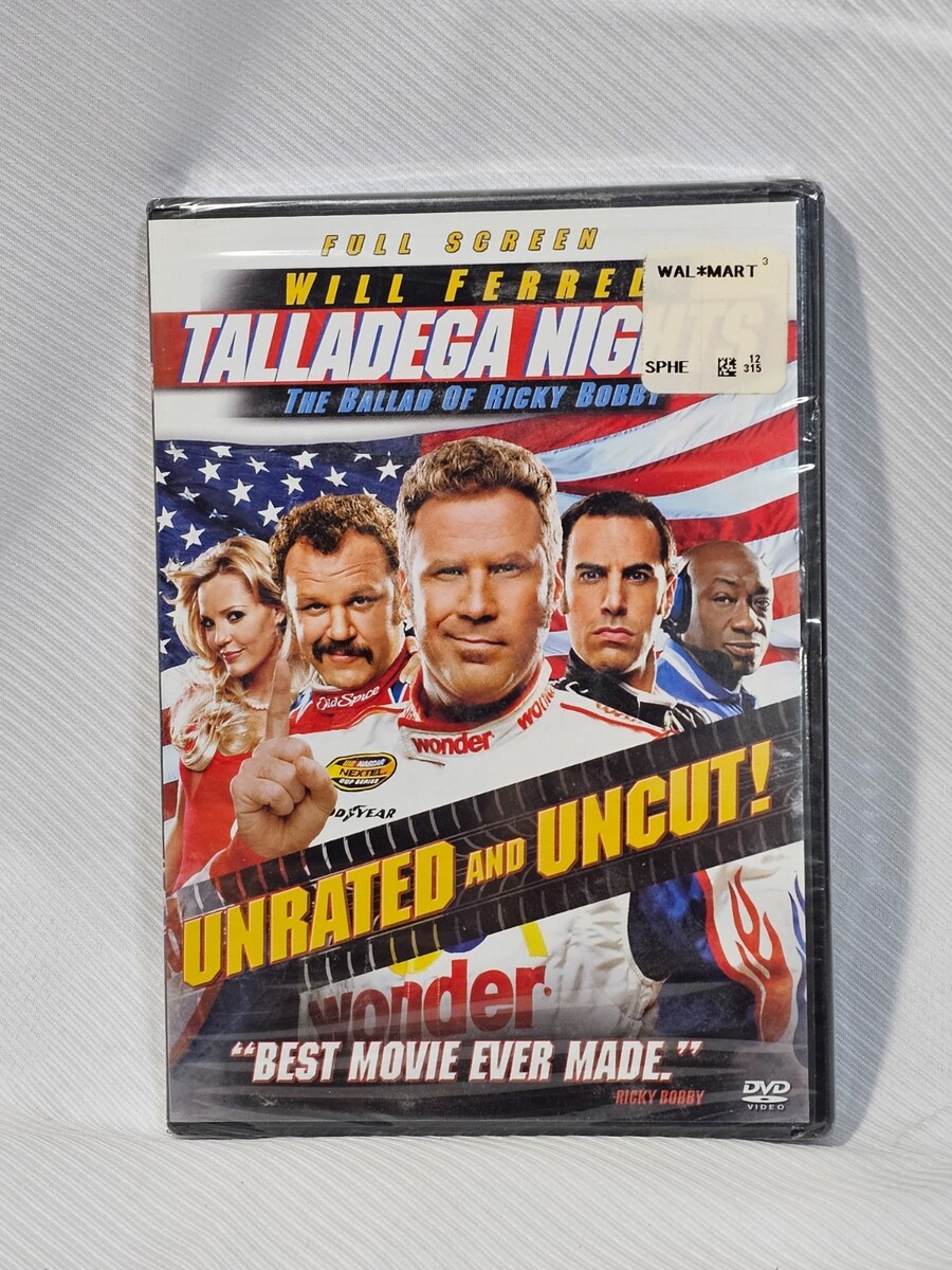 Description of item: Talladega Nights: The Ballad of Ricky Bobby (2006) is a high-speed comedy starring Will Ferrell as NASCAR legend Ricky Bobby, a fearless driver who lives by one motto: ?If you ain?t first, you?re last.? At the top of his game, Ricky has it all?fame, fortune, and a loyal best friend and teammate. But when a flamboyant French Formula One driver (Sacha Baron Cohen) challenges his dominance, Ricky?s world spins out of control. To reclaim his spot at the top, he must rediscover his confidence and get back in the driver?s seat.
