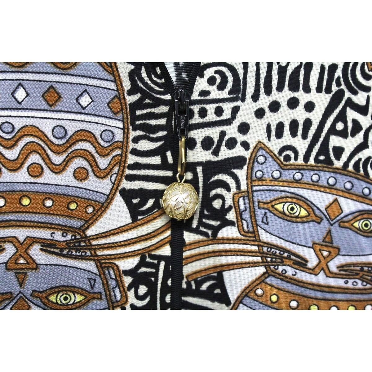 What you?ll love about this Lorraine mod cat print robe is the wildly graphic 1960s?70s batik feline pattern ? pure VLV lounge goddess energy. The slinky acetate/nylon knit drapes beautifully, and the oversized pearl zipper pull gives it that unapologetic retro glamour.