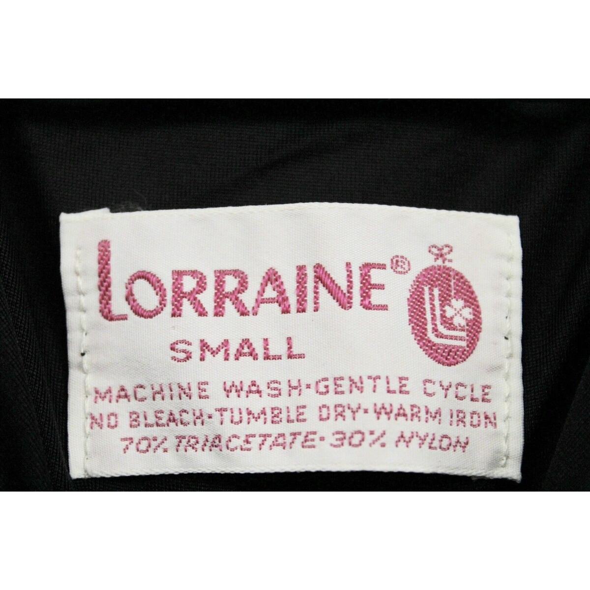 Lorraine was a major mid-century American lingerie and loungewear brand known for feminine silhouettes and quality synthetic blends (especially acetate/tricetate mixes) that mimicked silk but wore easily. This bold novelty print places it firmly in late 60s?early 70s mod lounge territory.
