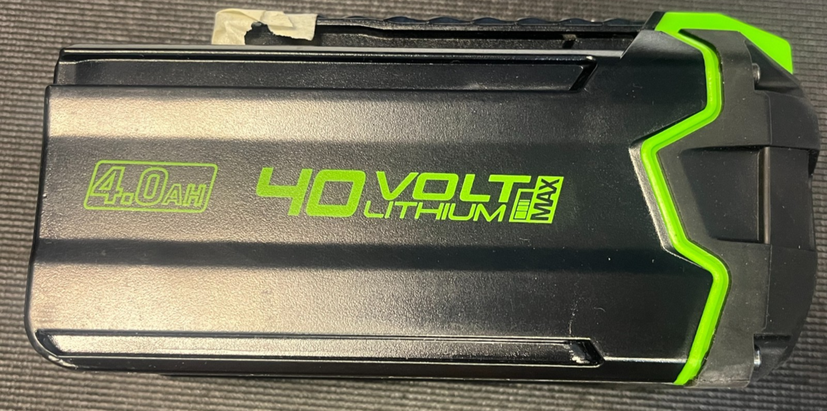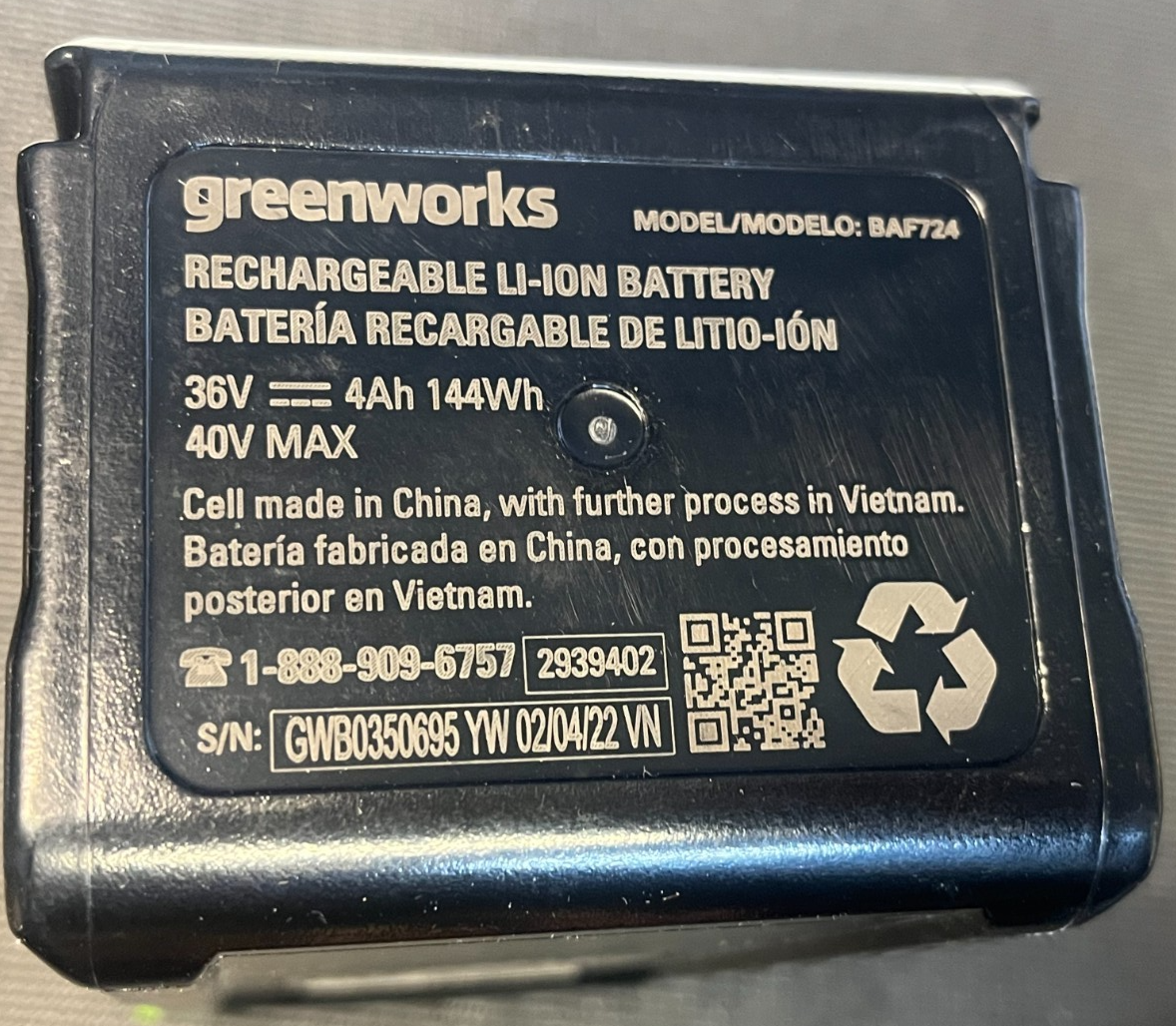 Greenworks G?MAX 40V 4Ah lithium?ion battery, model BAF724, for use with compatible Greenworks 40V tools like mowers, trimmers, blowers, and chainsaws. Battery is used and untested?it was pulled from a working environment, but we have not charged or load?tested it