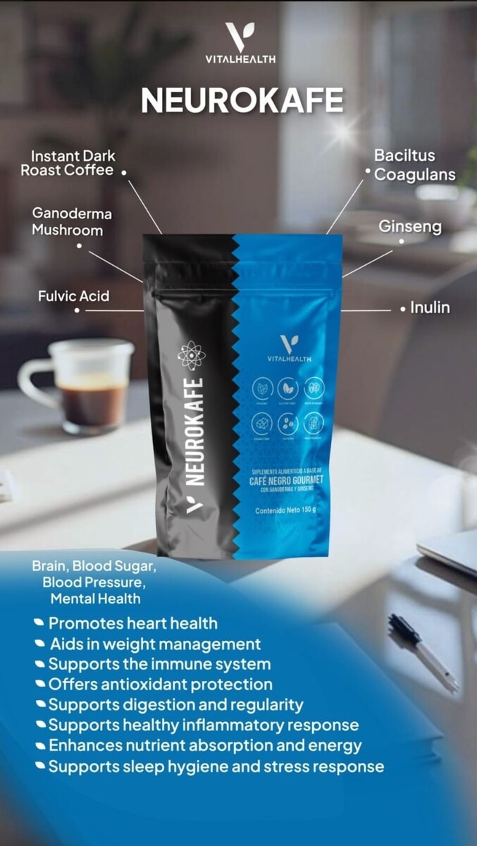 VITAL HEALTH V-NEUROKAFE Gourmet Dark Roast Coffee is a dietary supplement designed for general wellness, featuring a unique blend of active ingredients like probiotics, Ganoderma mushroom extract, and natural caffeine. This powder formulation offers a delicious coffee flavor while being sugar-free, gluten-free, and vegan friendly, making it suitable for various dietary preferences. The inclusion of Panax Ginseng, Fulvic Acid, and Bacillus coagulans further enhances its health benefits, making it a convenient and nourishing choice for those seeking a high-quality coffee supplement. It also helps you with intestinal flora problems