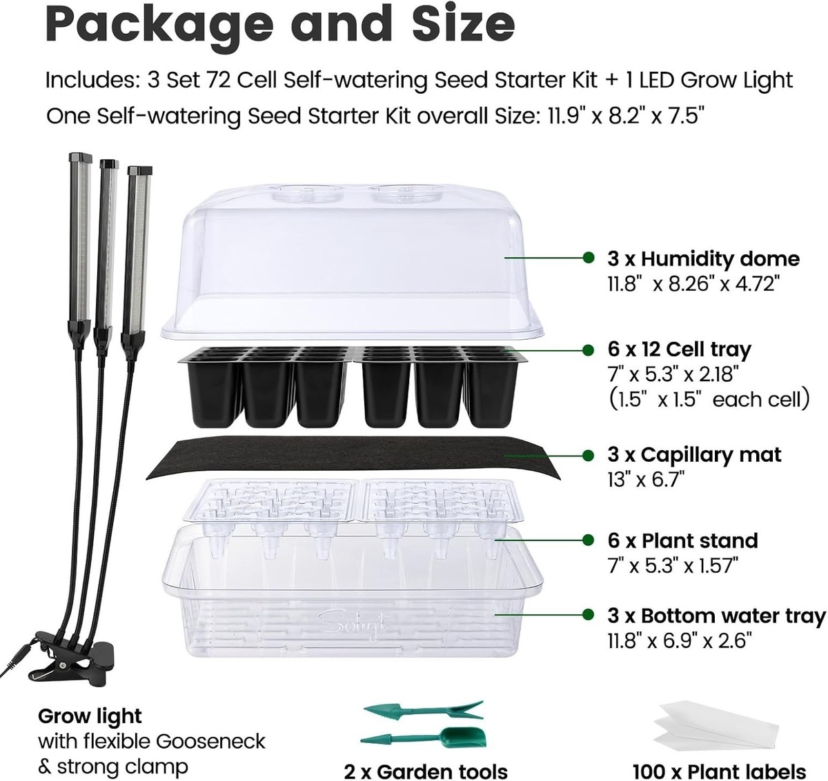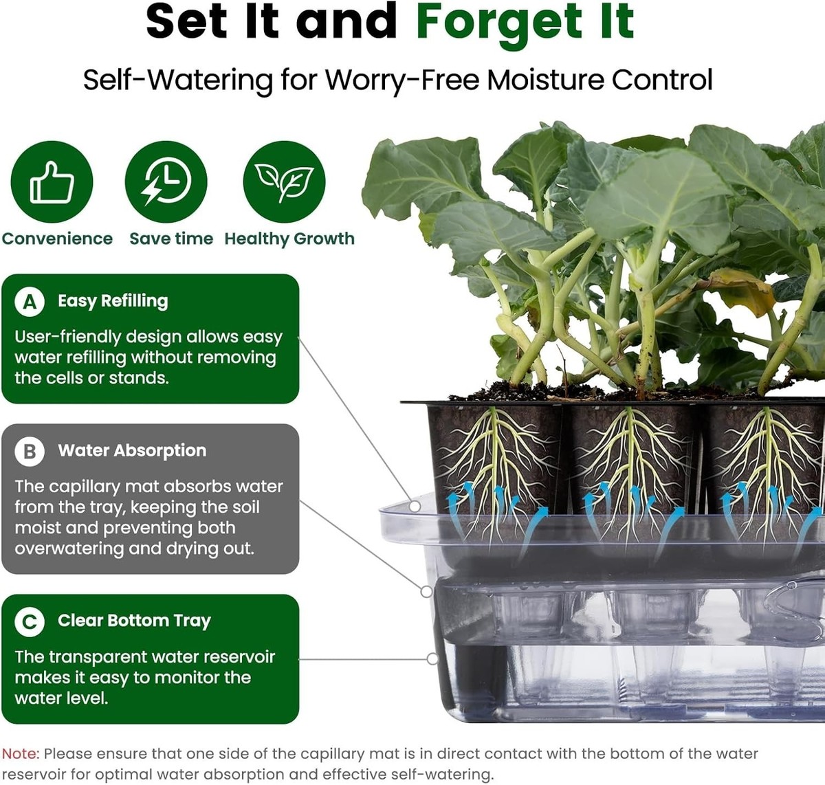 **Self-Watering System:** The innovative seedling starter tray with clear design helps maintain ideal moisture levels, ensuring the perfect environment for germination while avoiding the pitfalls of overwatering or drying out.