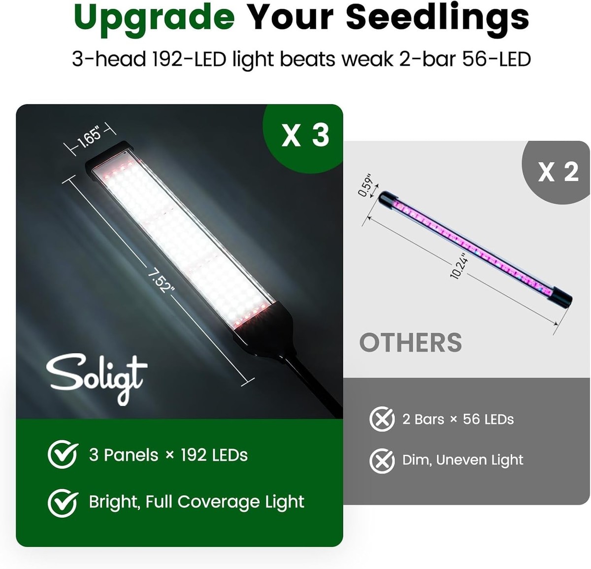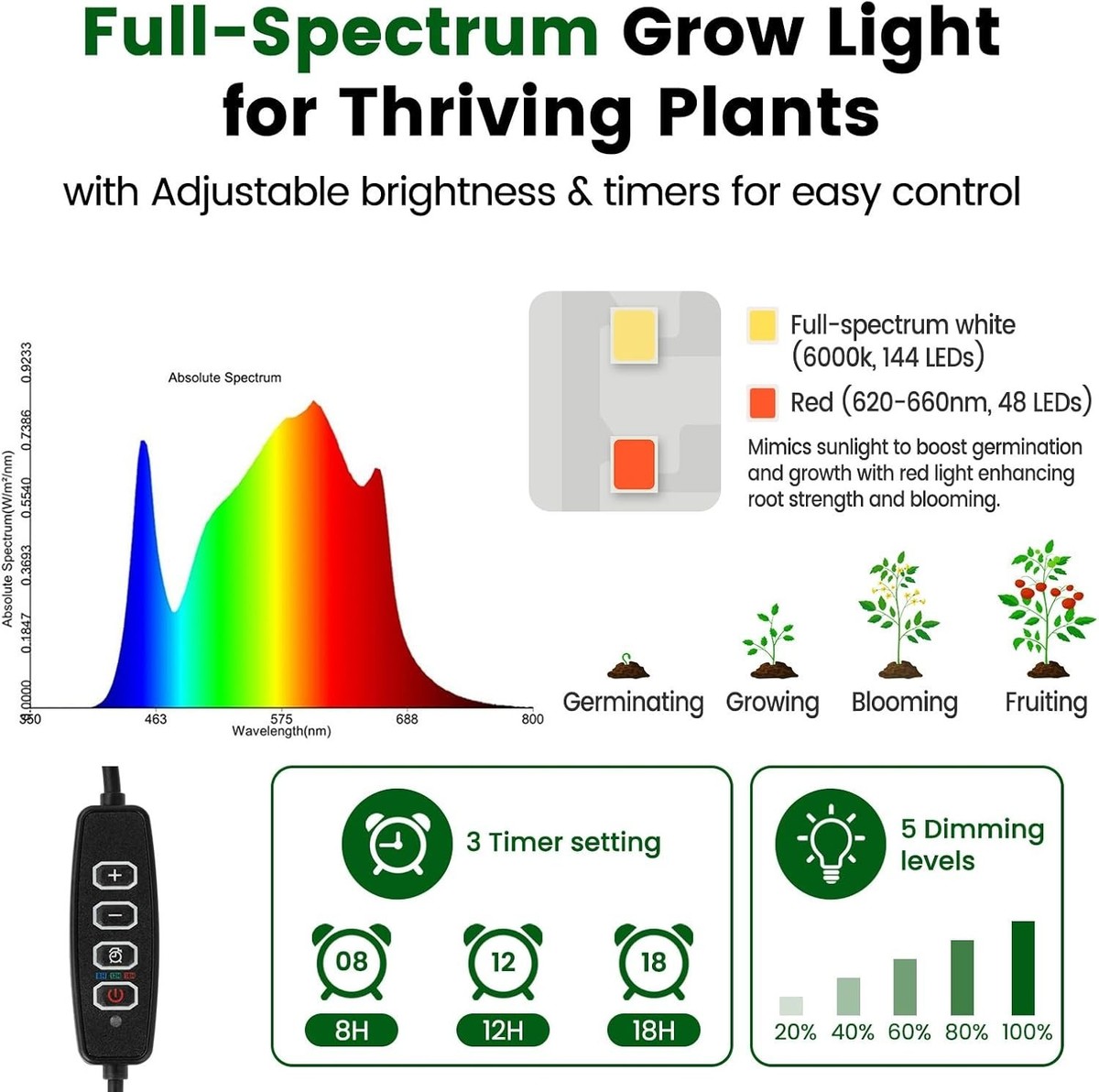 **High-Brightness LED:** Enjoy full-spectrum light from a powerful 15W grow light featuring 144 cold white (6000K) and 48 red LEDs. Its flexible goose neck and strong clamp allow for precise positioning, promoting swift seedling growth and vibrant plants.