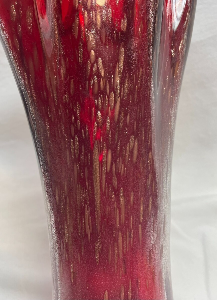 Mid 2oth Century Murano Ruby Red Hand Blown Art Glass 10" Swung Vase Gold Foil