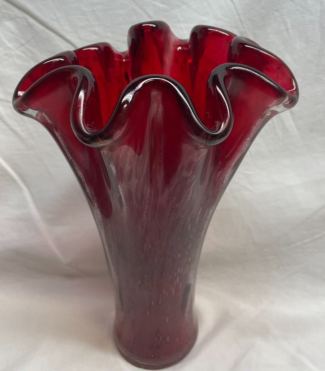 This is a Mid 20th Century Murano Ruby Red Hand Blown Art Glass 10" Swung Vase. It is 10 inches tall. Has a gold glitter or foil inside the glass. Looks AWESOME! Very Heavy High Quality Swung Vase. It is from sometime between the 1940's and 1960's I believe it is from Italy. It is in Great Condition. There is one small imperfection on the top of the vase. See 7th picture for a close up. It is very small. Could be small chip, but feels more like a small rough spot. CLEAN! Combine auctions to save on shipping. Please contact me if you need to make other payment arrangements. EAG
