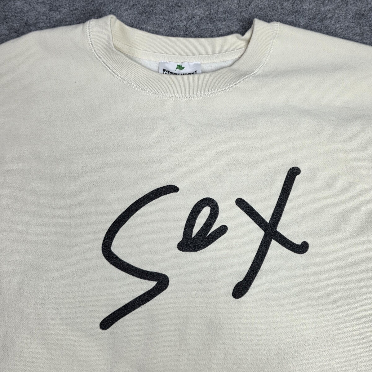 Front graphic: "Sex" script print