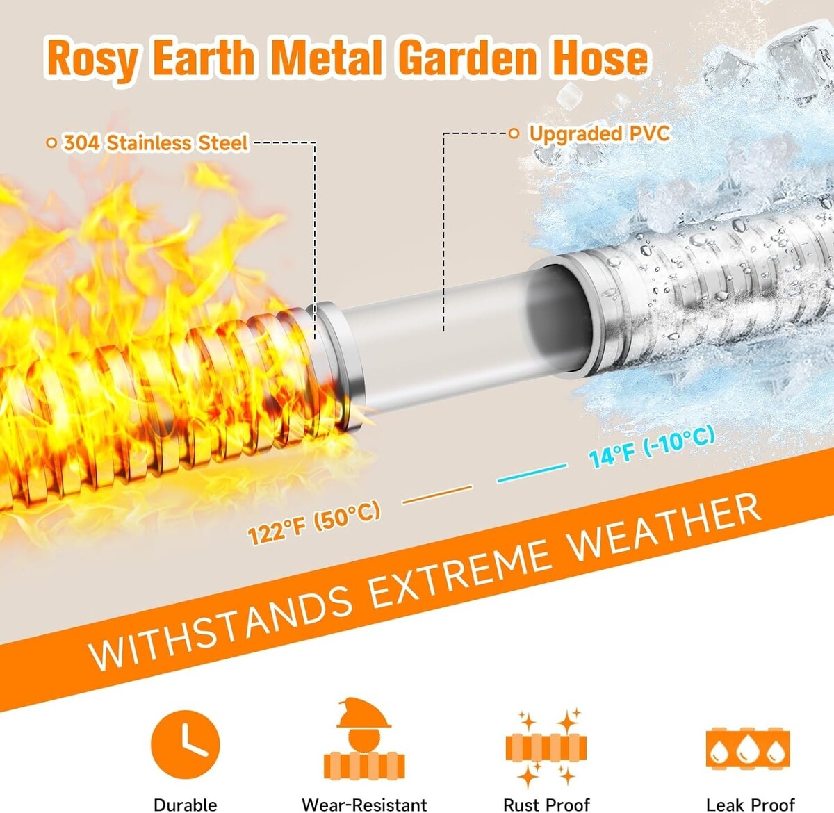 Corrosion and rust-resistant material prolongs the life of the hose.