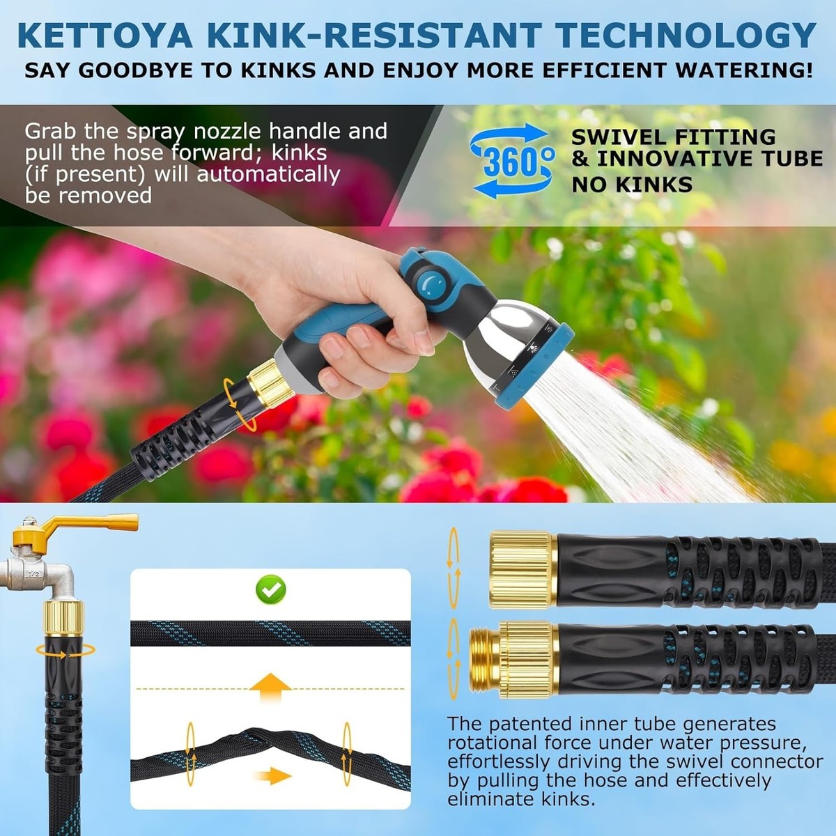 Anti-Kink Technology: 360 rotating connectors and patented PVC inner tube prevent kinks for smooth water flow.