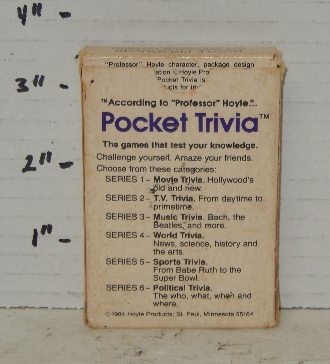 For Sale is a 1984 Hoyle Television Trivia Playing Card Game Series 2. its in good condition as seen in the pictures provided what you see is what you will receive. Please ask Any and All Questions prior to purchasing. Fast Same or Next day shipping with Free Delivery Confirmation within the U.S. Payment Due within 7 days of purchase (if you need more time please let us know In advance) we love to combine shipping is always a Yes and Most of the time Additional Items Ship for free.