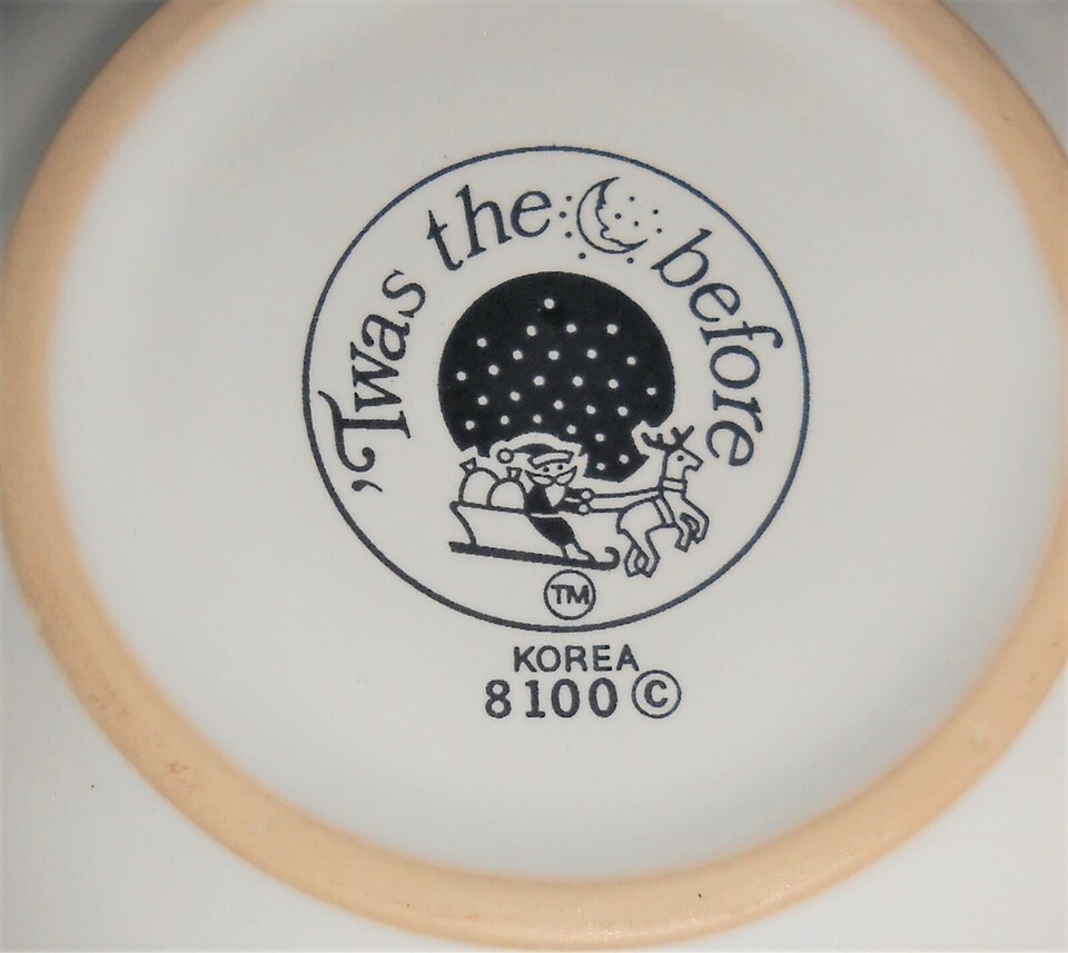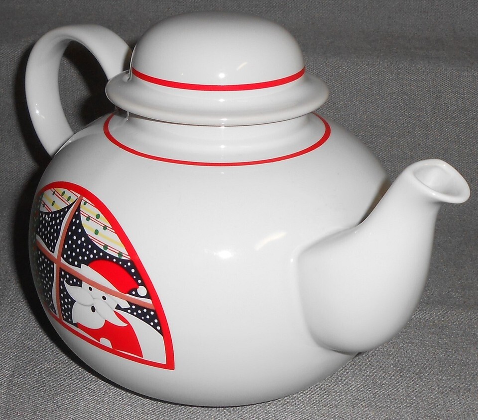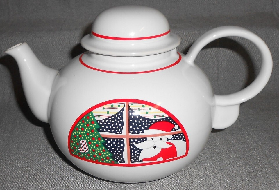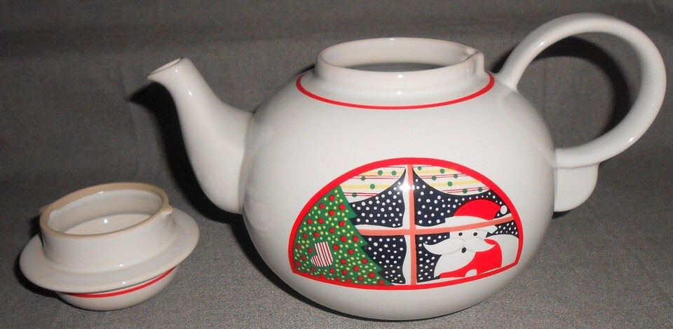 This is the Four Cup Teapot with the Holiday - Christmas theme from Epoch in the Twas The Night Before Christmas Pattern and Made in Korea. It measures approx 9 1/4" across from handle to spout and it is in good pre-owned condition with no chips or cracks.