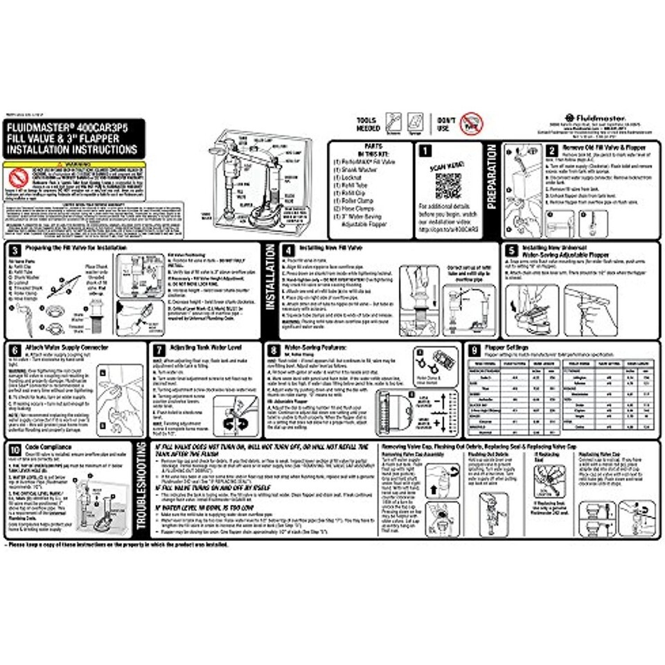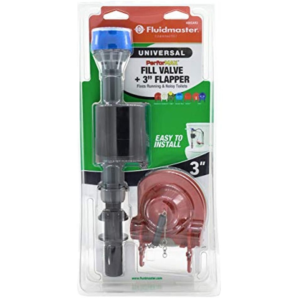 Product Description The Fluidmaster 400CAR3P5 optimizes your toilet from fill to flush. The PerforMAX fill valve, the quietest and most powerful fill valve on the marked fixes common noise and slow fill problems. While the 3? adjustable flapper, saves water with a dial controlled water release level. Recommended for best use in toilets 1.6 GPF and less, this design fits more models, with it?s adjustable height and flapper adjustable arms. The PerforMAX Toilet Fill Valve and 3? Flapper Kit also showcase a quality build, with corrosive resistant materials, solid flapper frame and silicone seal. For a complete performance upgrade of your toilet, this Fluidmaster 400CAR3P5 PerforMAX Kit for 3? Flush Valves is a top choice. From the Manufacturer Fluidmaster, the customer?s first choice and preferred supplier of toilet tank trim since 1957. Showcasing a complete line of toilet repair parts that include; fill valves, flush valves, flappers, tank levers, dual flush valves, bowl wax, toilet repair kits, seals, connectors and more. Fluidmaster?s manufacturing facilities across the world reach over 90 countries worldwide with unparalleled quality. Fluidmaster remains the #1 toilet repair brand in the world, with parts found in more toilets than all other brands.