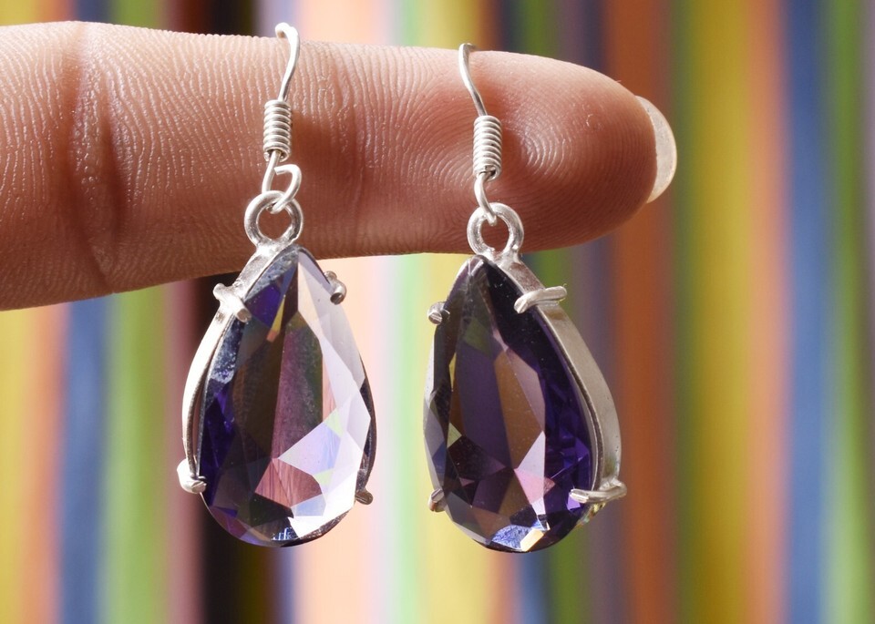 925 Silver Handmade Amethyst Tear Drop Shape Women Bezel Earrings Daily Wear