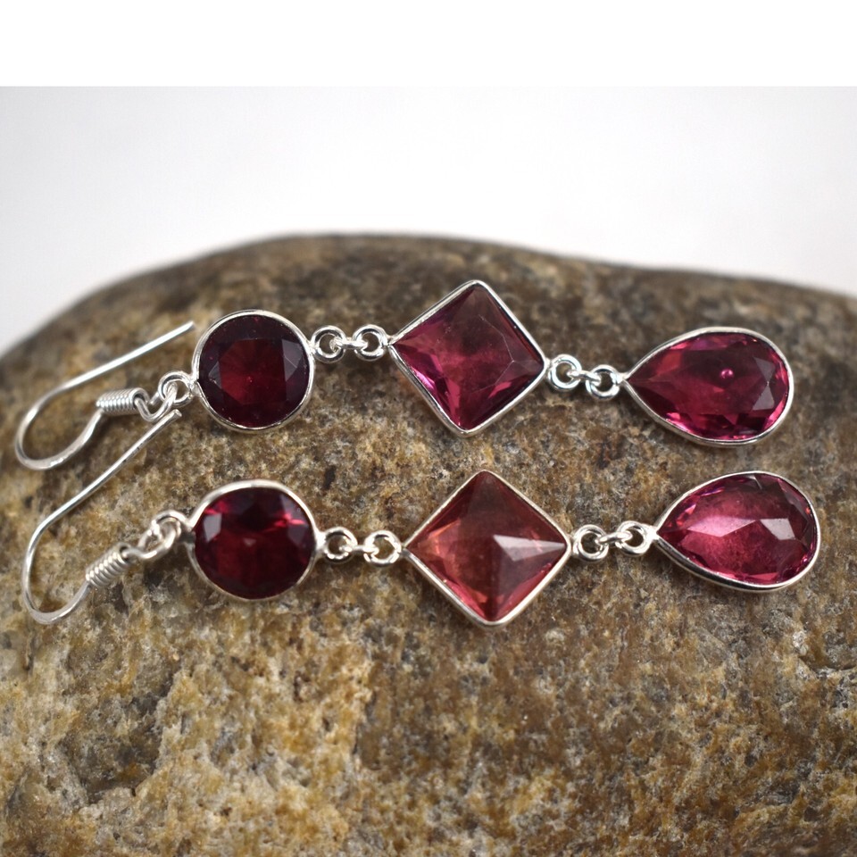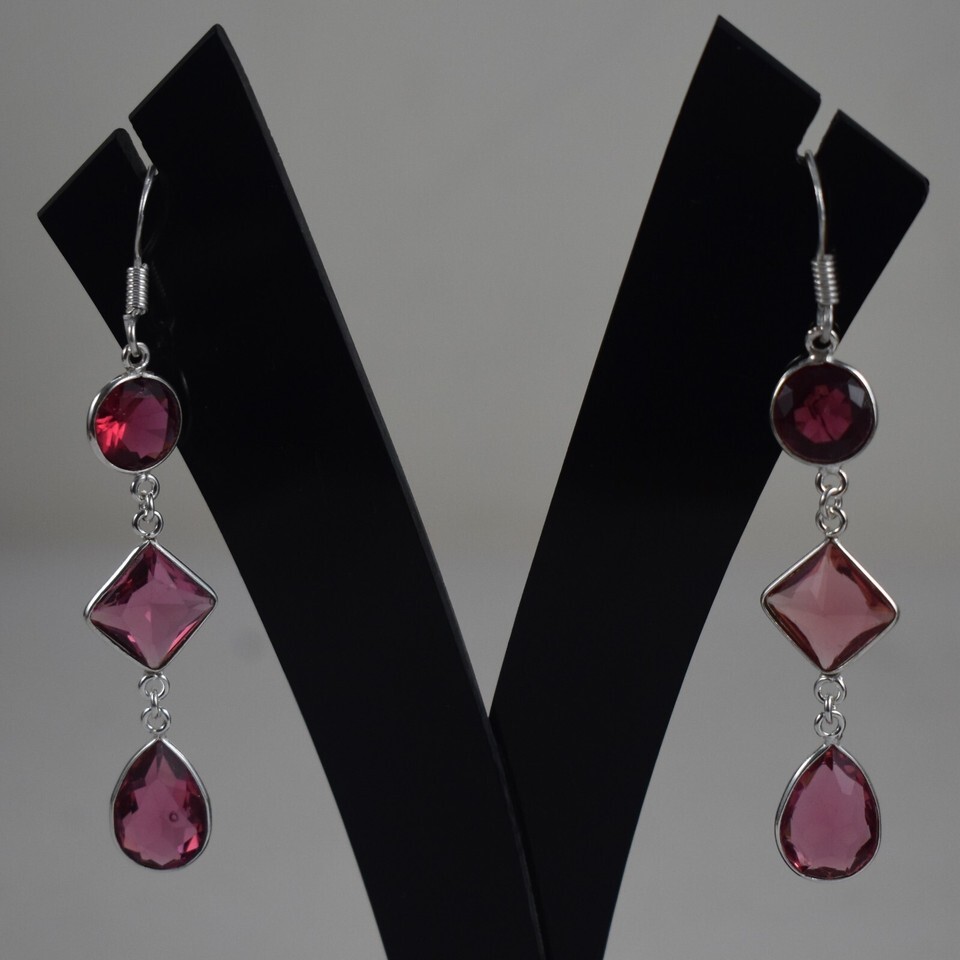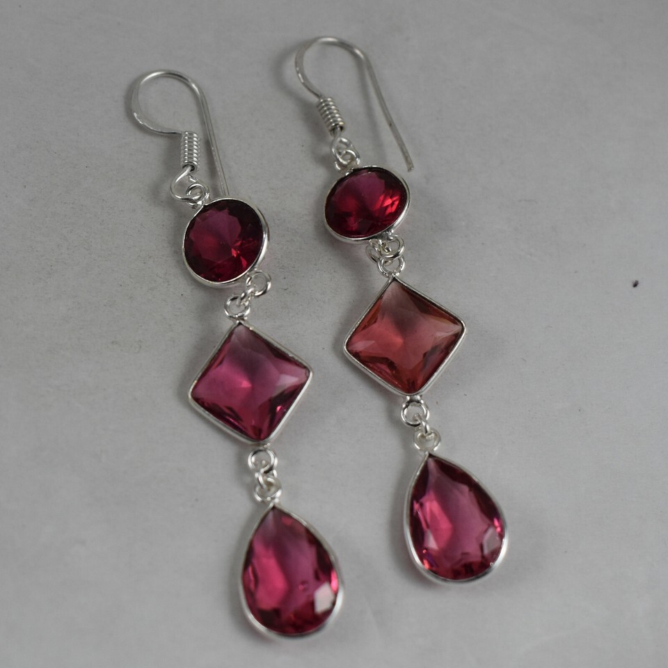 925 Sterling Silver Garnet & Pink Quartz Gemstone Handmade Earrings Gift BES1562
