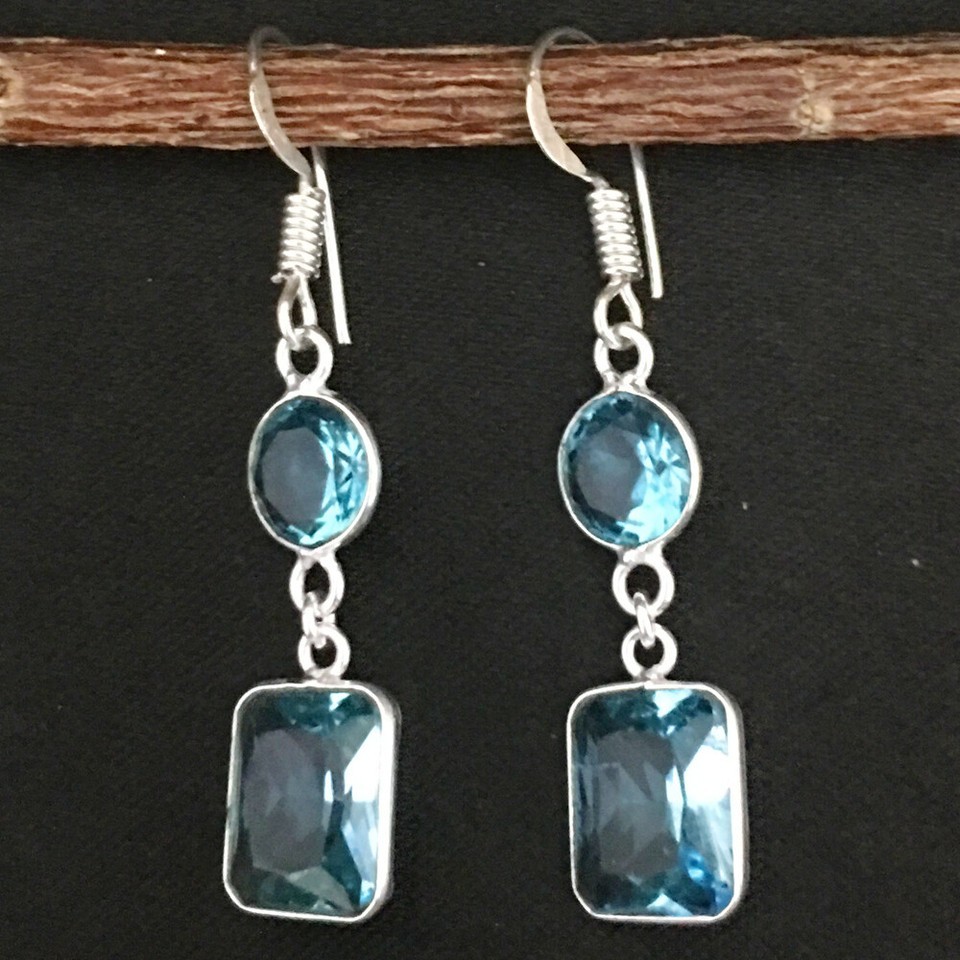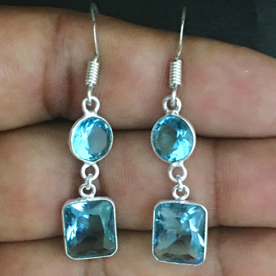 925 Sterling Silver Handmade Blue Topaz Bezel Earrings Fest Gift Women BES-1043