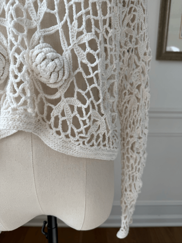 Vintage 90s Y2K, one step up open weave crochet, long sleeve crop top. Tag size one size fits most, however, based on the measurements it would be fitted on a large. Laying flat measures 17? shoulder to hem and 20? armpit to armpit. Cotton ramie blend.