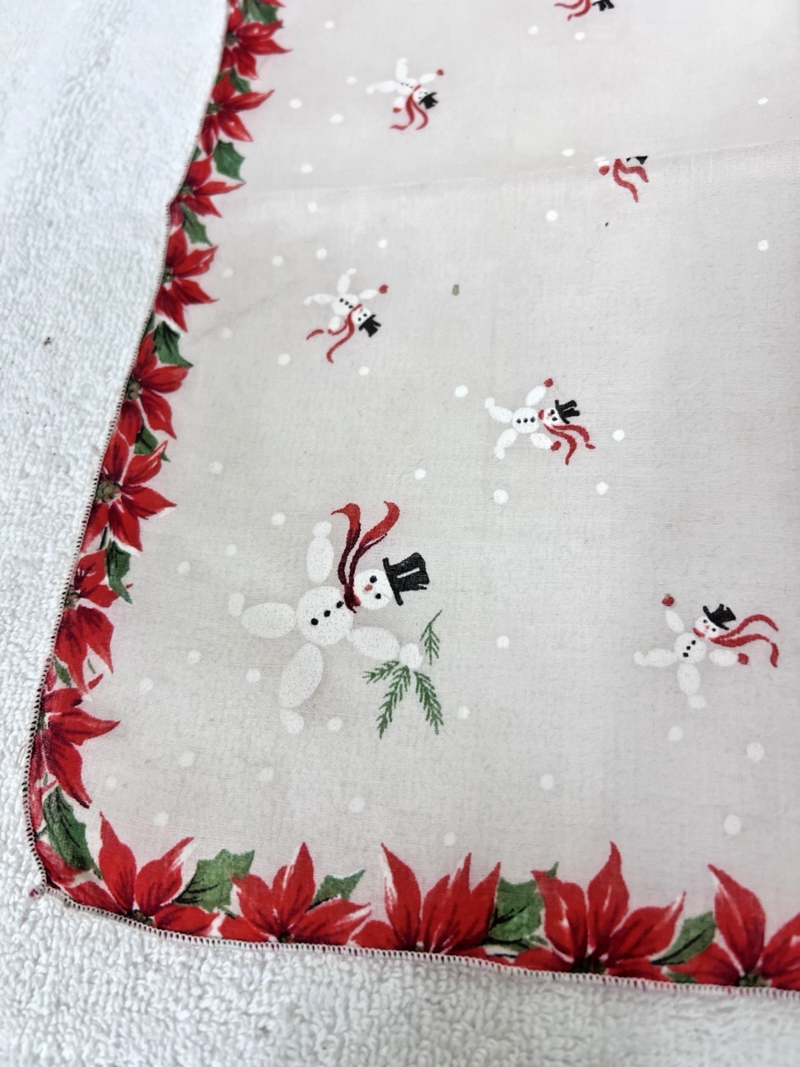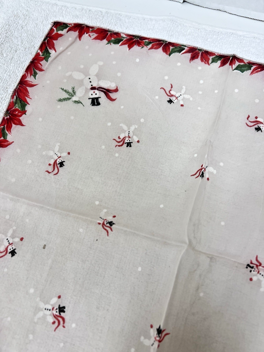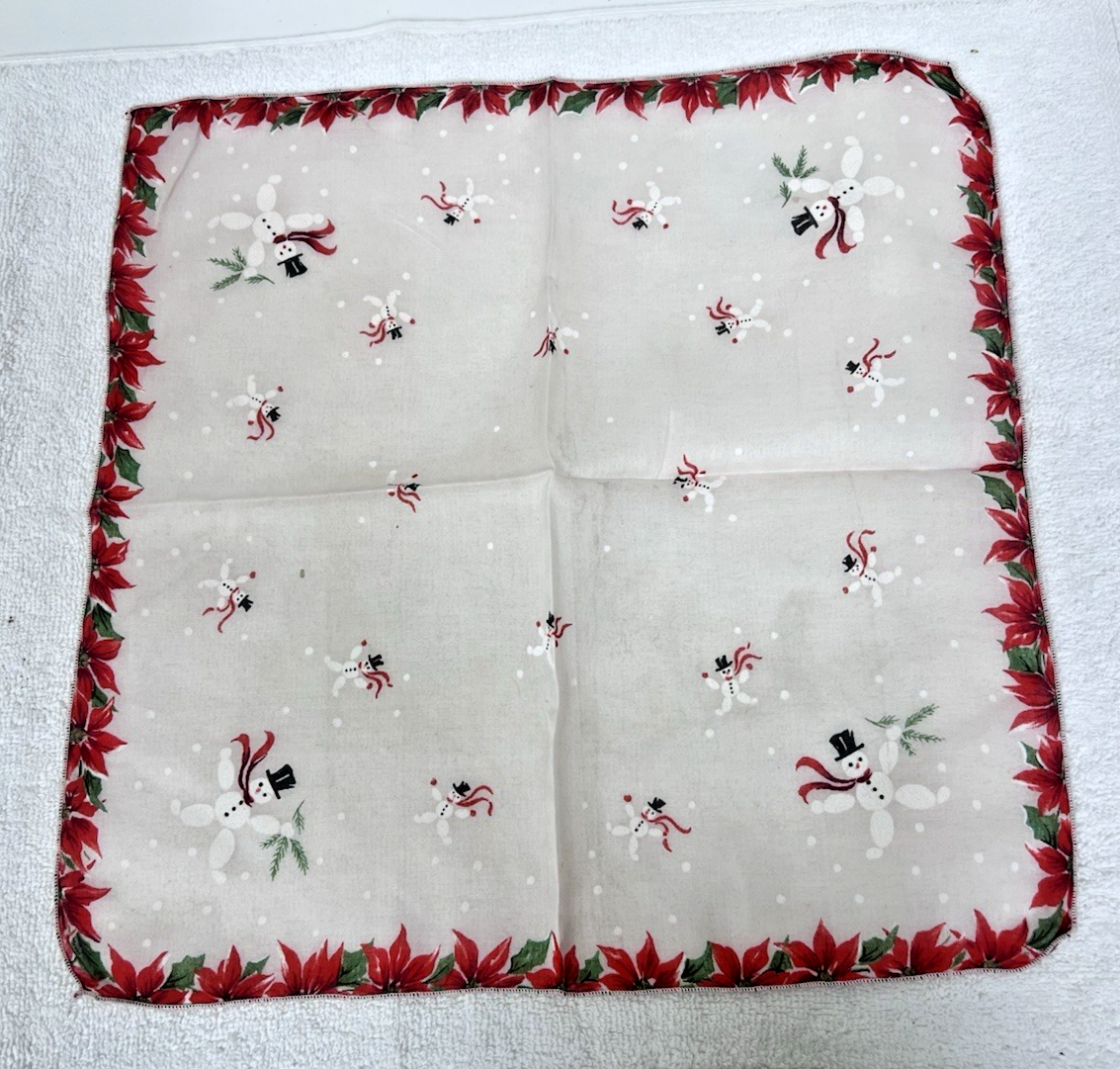 Vintage Christmas Hankie Jumping Snowmen Snowballs Poinsettias 13.5"